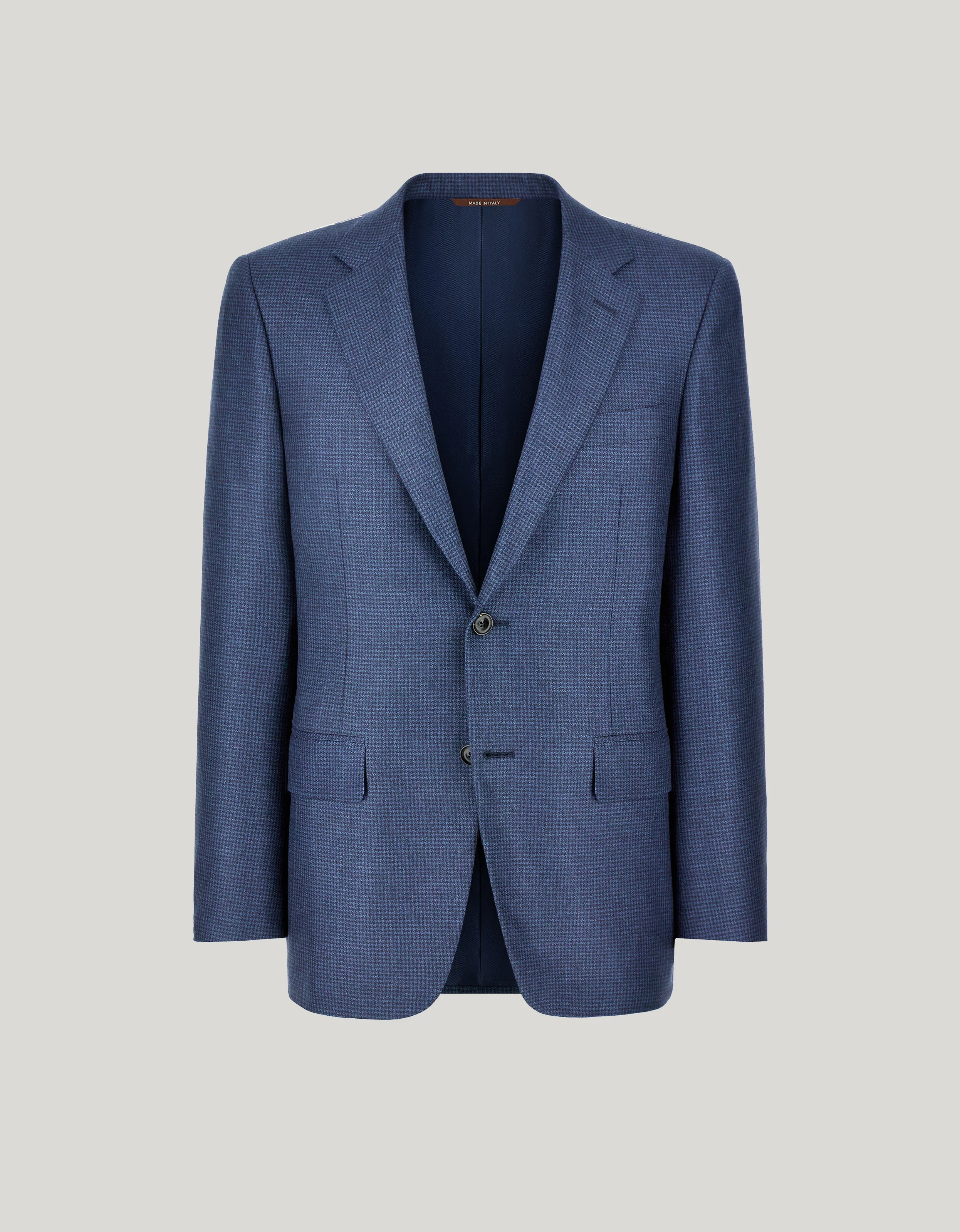 The tailored perfection of our silk and cashmere jacket makes it the ideal choice for lovers of timeless elegance. This single-breasted two-button model stands out for its houndstooth pattern, which enhances the silhouette with a perfect balance between comfort and style. Made to last, it is an essential item in every man's wardrobe. Refined and functional, it represents the epitome of contemporary sophistication. FABRICS AND CRAFTSMANSHIP - Single-breasted two-button jacket - Welted pockets with flap and slit breast pocket - This garment does not come with buttons or buttonholes at the end of the sleeves, allowing the customer to customize the length of the sleeves - Jacket length 75 cm in size 50 - 53% silk 47% cashmere - Made in Italy CARE Do not wash with water Do not bleach Normal steam or dry iron on low (150°) Dry clean with perchlorethylene Do not tumble dry FIT Regular fit In the Contemporary model, the length of the jacket is regular, with well-defined shoulders but with thin shoulder pads, and standard lapels. The model is wearing a size 48 The model measures: Height: 186 cm (73.2 in) Chest: 81 cm (31.9 in) Waist: 70 cm (27.6 in) Hips: 82 cm (32.3 in)
