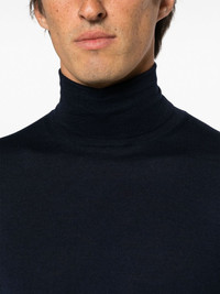 fine-knit roll-neck jumper Highlights - Navy blue - Fine knit - Roll neck - Long sleeves - Ribbed cuffs and hem Made in Italy Composition Wool 35%, Cashmere 35%, Silk 30% SIZE & FIT Model measurements Height 6 ft 2 in(1.89 m) Bust/Chest 37.79 in(96 cm) Hips 37 in(94 cm) Waist 29.92 in(76 cm) FittingInformation Designed for a slim fit, offering a comfortable fit that sits just away from the body Made with a midweight knit, this piece offers some stretch This piece fits true to size – take your usual size Washing instructions Hand Wash
