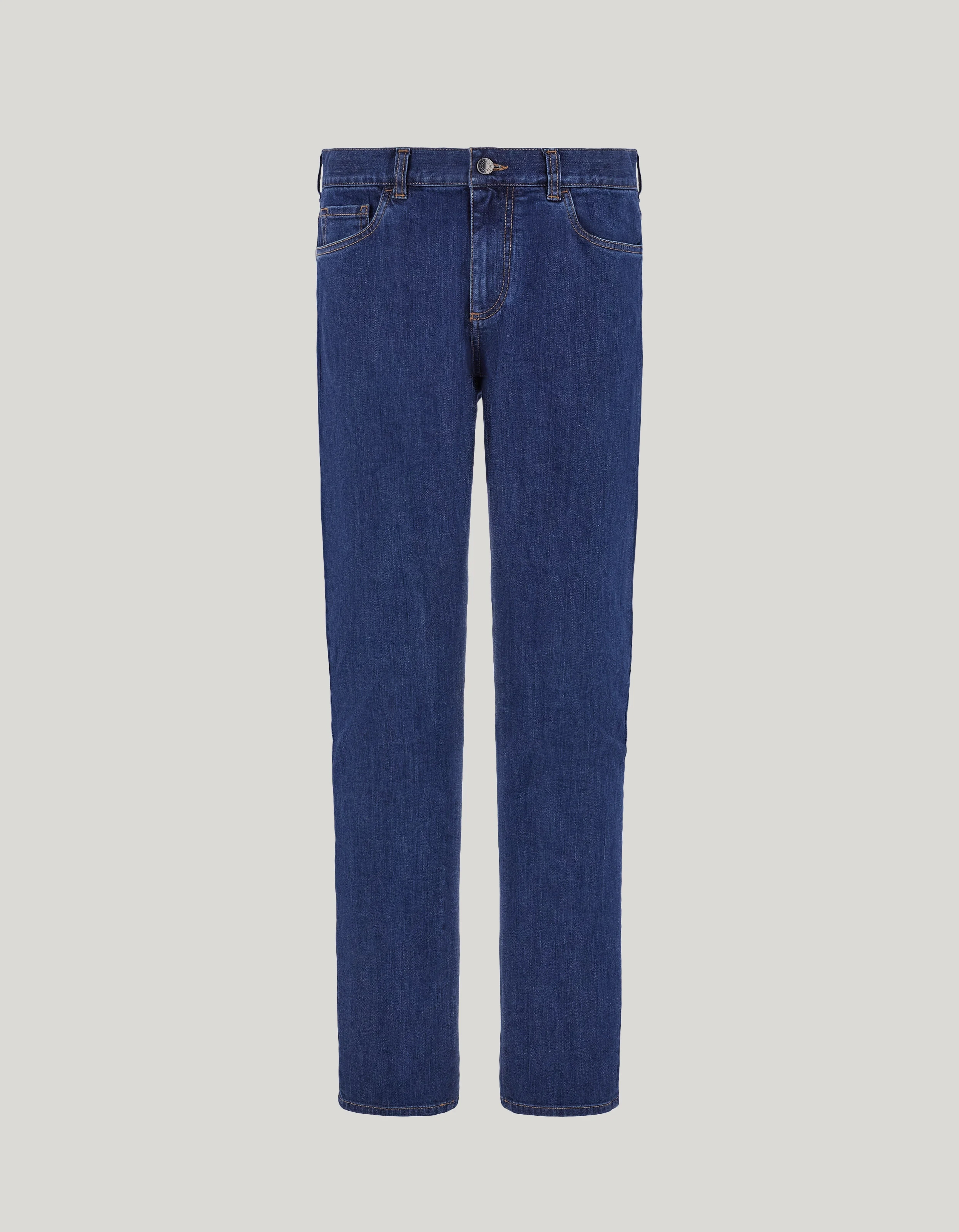 Five-pocket stretch denim pants with a sophisticated design, made with the defined lines of the regular fit. Stylish details, such as the washable genuine leather label, enhance the uniqueness of this casual garment, designed to add a sophisticated and personal twist to the more casual looks of today's gentleman. FABRICS AND CRAFTSMANSHIP - Five-pocket denim jeans - Central fly with a metal button - Rear patch pockets - Washable genuine leather label on the back of the waistband - Stretch denim - 10 oz - 98% cotton 2% elastomer - Made in Italy CARE Machine wash max 30° - delicate cycle Do not bleach Normal steam or dry iron on low (110°) Do not dry clean Do not tumble dry FIT Slim Fit The model is wearing a size 48 The model measures: Height: 188 cm Chest: 93 cm Waist: 73 cm Hips: 91 cm