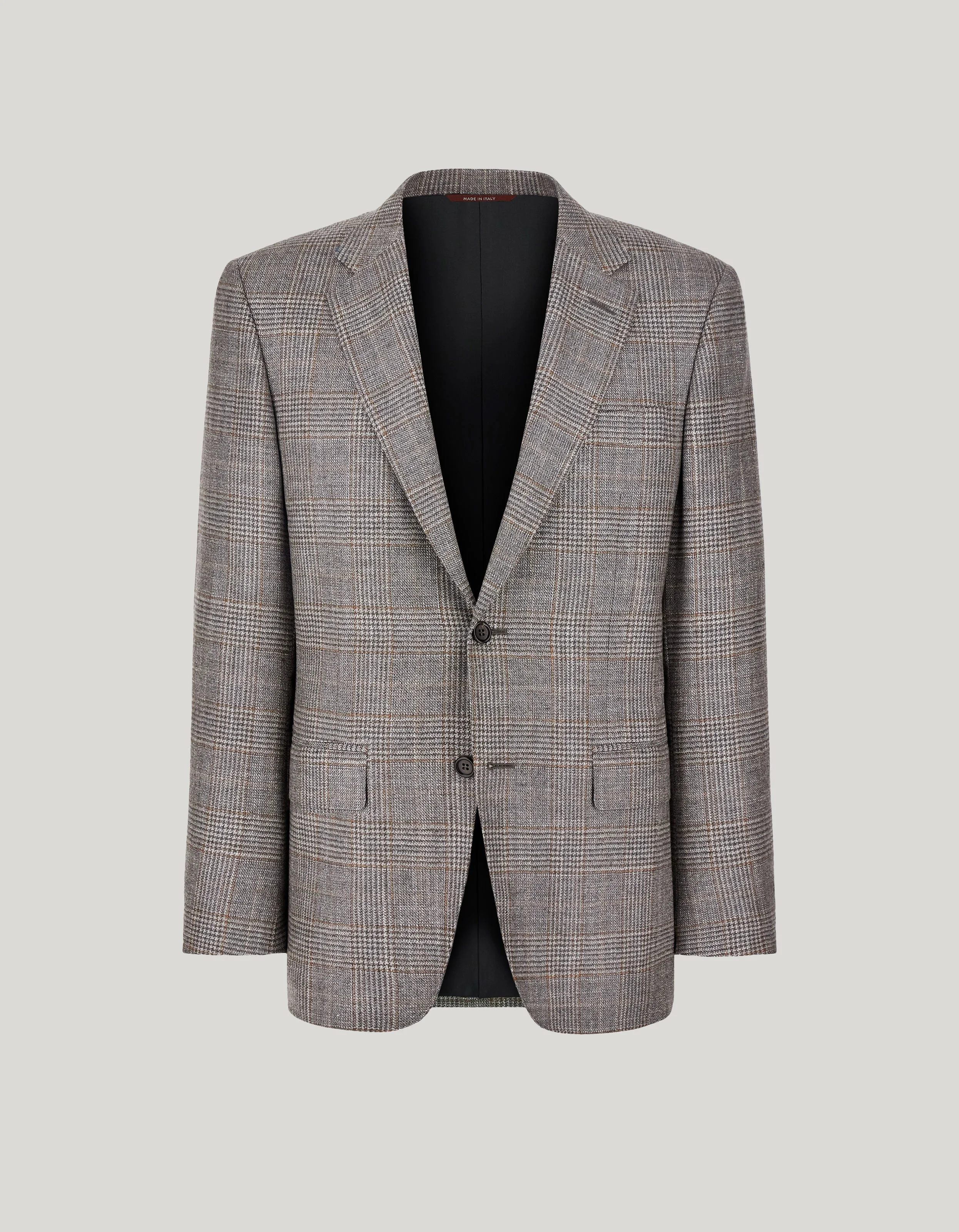 Single-breasted jacket in wool, silk and cashmere, materials that enhance its quality and comfort. The regular cut ensures a perfect fit that exalts the silhouette without sacrificing movement. The design and unique combination of yarns make this garment extremely versatile and suitable for multiple occasions, from work to more formal events, always ensuring contemporary elegance and a polished look. FABRICS AND CRAFTSMANSHIP - Single-breasted two-button jacket - Welted pockets with flap and slit breast pocket - Jacket length 75 cm in size 50 - 86% wool 10% silk 4% cashmere - Made in Italy CARE Do not wash with water Do not bleach Normal steam or dry iron on low (150°) Dry clean with perchlorethylene Do not tumble dry FIT Regular fit In the Contemporary model, the length of the jacket is regular, with well-defined shoulders but with thin shoulder pads, and standard lapels. The model is wearing a size 48 The model measures: Height: 192 cm (75.6 in) Chest: 93 cm (36.6 in) Waist: 67 cm (26.4 in) Hips: 88 cm (34.7 in)