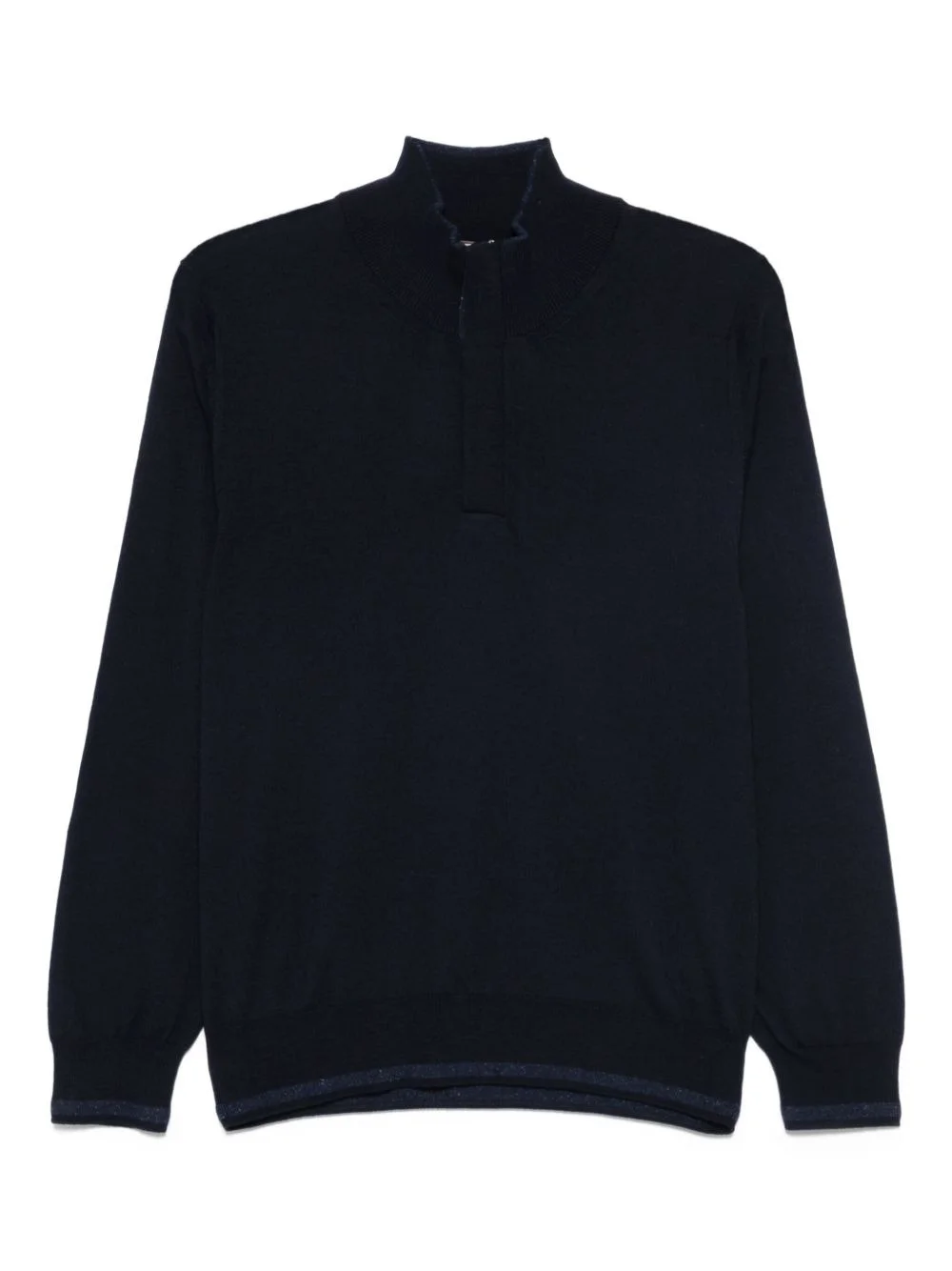 half-zip high-neck sweater Highlights - Navy blue - Half-zip fastening - High neck - Long sleeves - Ribbed cuffs - Metallic trim Made in Italy Composition Wool 97%, Silk 1%, Viscose 1%, Polyamide 1% SIZE & FIT Model measurements Height 6 ft 0 in(1.84 m) Bust/Chest 37.79 in(96 cm) Hips 37 in(94 cm) Waist 31.49 in(80 cm)