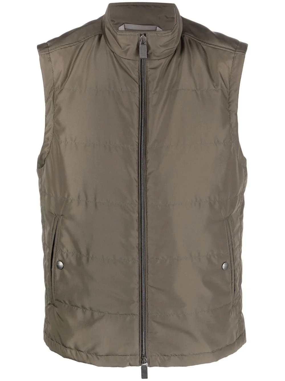 high-neck zip-up gilet moss green padded design two side welt pockets front two-way zip fastening high neck sleeveless straight hem Made in Italy Composition Outer: Polyester 100% Lining: Polyester 100% SIZE & FIT Model measurements Height 6 ft 2 in(1.87 m) Bust/Chest 36.41 in(92.5 cm) Hips 37 in(94 cm) Waist 29.52 in(75 cm) FittingInformation This piece fits true to size. We recommend you get your regular size Cut for a slim fit Made with a mid-weight non-stretch fabric Washing instructions Dry Clean Only