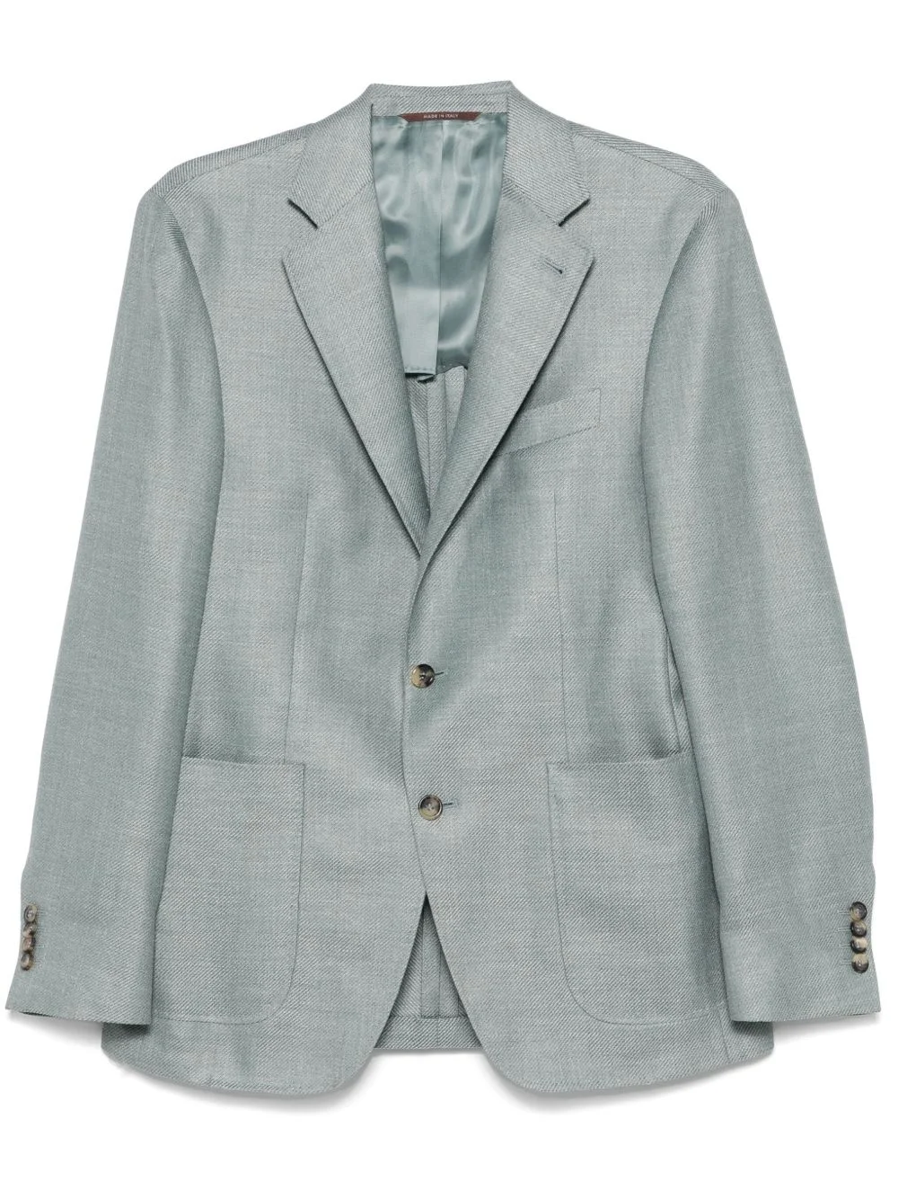 interwoven blazer Highlights - Teal blue - Front button fastening - Buttoned cuffs - English rear vents Made in Italy Composition Lining: Cupro 100% Outer: Wool 65%, Silk 21%, Linen/Flax 14% SIZE & FIT Model measurements Height 6 ft 2 in(1.89 m) Bust/Chest 35.03 in(89 cm) Hips 38.18 in(97 cm) Waist 29.92 in(76 cm) FittingInformation Designed for a slim fit, offering a comfortable fit that sits just away from the body The vented hem offers movement at the rear Made from a midweight non-stretch fabric