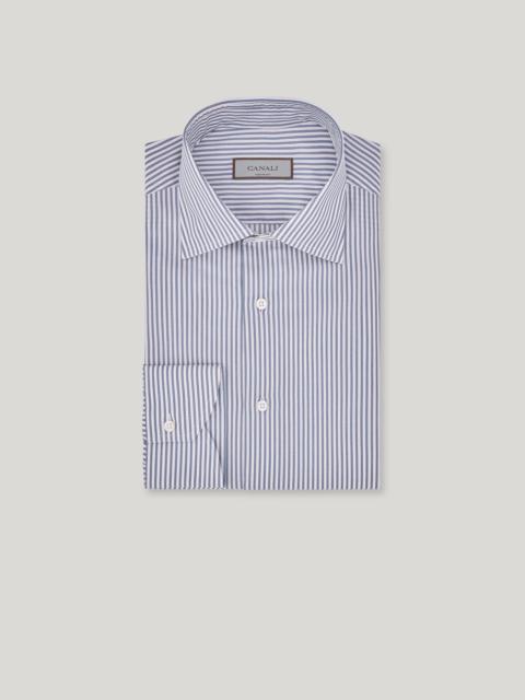 This striped cotton shirt combines a regular fit with a clean, elegant design, highlighted by the discreet collar. Made from pure cotton, it offers lasting comfort and is easy to pair with different outfits, making it ideal for any occasion, from work to special events. The excellent craftsmanship emphasizes a refined, polished look, enhancing the figure without sacrificing comfort. FABRICS AND CRAFTSMANSHIP - Formal shirt - Semi-spread collar - Collar height 4.2 cm - Removable collar stiffeners - Plain back with no wrinkles - Plain front with no placket - Semi-rounded cuff - 100% Cotton - Made in Italy CARE Machine wash max 30° - delicate cycle Do not bleach Normal steam or dry iron on low (110°) Gentle dry clean with perchlorethylene Do not tumble dry FIT Regular fit The model is wearing a size 50 The model measures: Height: 185 cm (72.8 in) Chest: 100 cm (39.4 in) Waist: 79 cm (31.1 in) Hips: 95 cm (37.4 in)