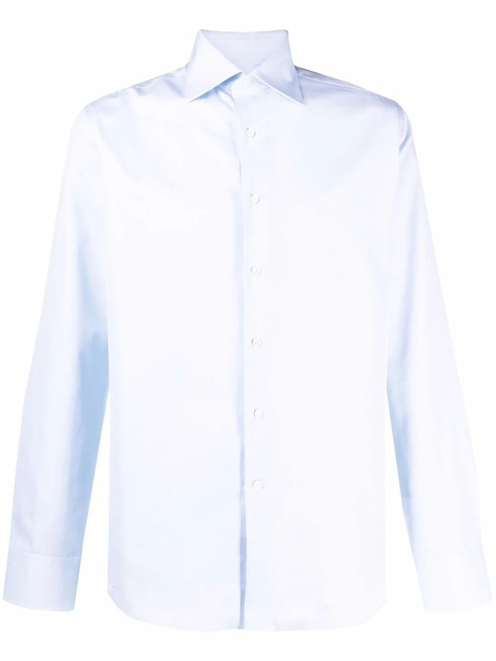 button-up cotton shirt blue cotton cutaway collar front button fastening long sleeves buttoned cuffs curved hem Made in Italy Composition Cotton 100% SIZE & FIT Model measurements Height 6 ft 2 in(1.89 m) Bust/Chest 35.43 in(90 cm) Hips 36.61 in(93 cm) Waist 28.74 in(73 cm) FittingInformation This piece fits true to size. We recommend you get your regular size Classic fit Made with a mid-weight non-stretch fabric