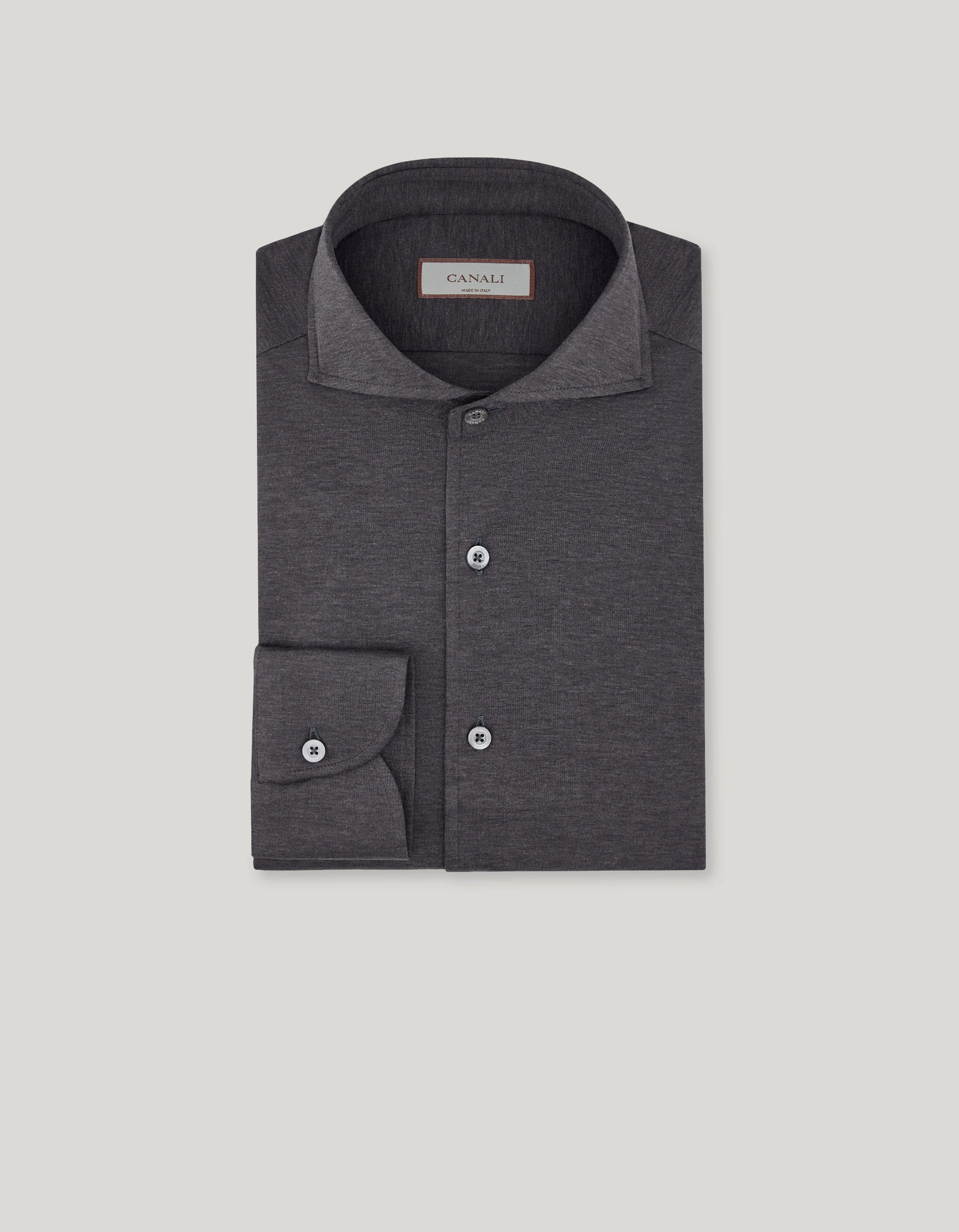 Casual cotton jersey shirt with a cutaway collar, distinguished by a versatile colour scheme and the comfortable lines of the regular fit, which accompany the body's movements in complete comfort. A garment with a clean design, without no placket on the front, for the man who combines elegance and versatility. FABRICS AND CRAFTSMANSHIP - Casual shirt - Cutaway collar - Collar height: 3.8 cm - Smooth front with no placket - 100% cotton - Jersey - Made in Italy CARE Machine wash max 30° - delicate cycle Do not bleach Normal steam or dry iron on low (110°) Do not dry clean Dry flat FIT Regular Fit The model is wearing a size 48 The model measures: Height: 188 cm Chest: 94 cm Waist: 75 cm Hips: 93 cm