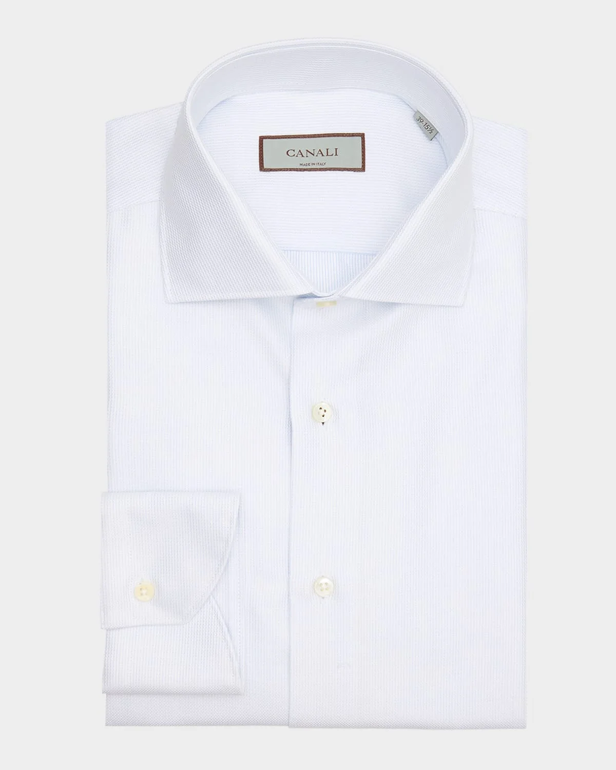 - Canali dress shirt in cotton in micro-textured cotton - Spread collar - Button placket - Long sleeves - Round barrel cuffs - Shirttail hem - Cotton - Dry clean - Made in Italy