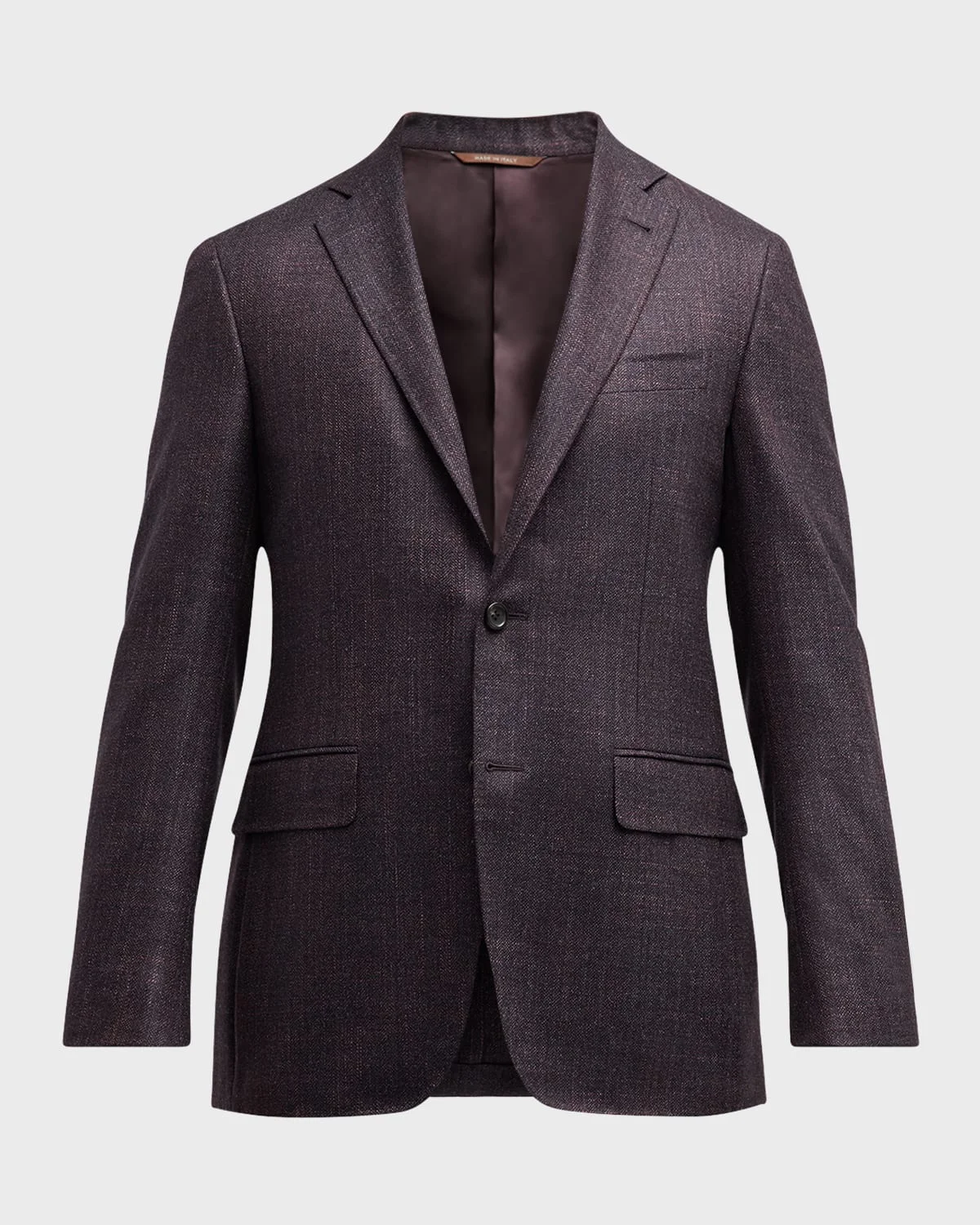 - Canali melange blazer - Notched lapels - Two-button closure - Chest welt pocket - Side flap pockets - Unfinished sleeves - Double-vented back - Wool/silk/cashmere - Lining: Cupro - Dry clean - Made in Italy - Model is 6'1"/185cm.