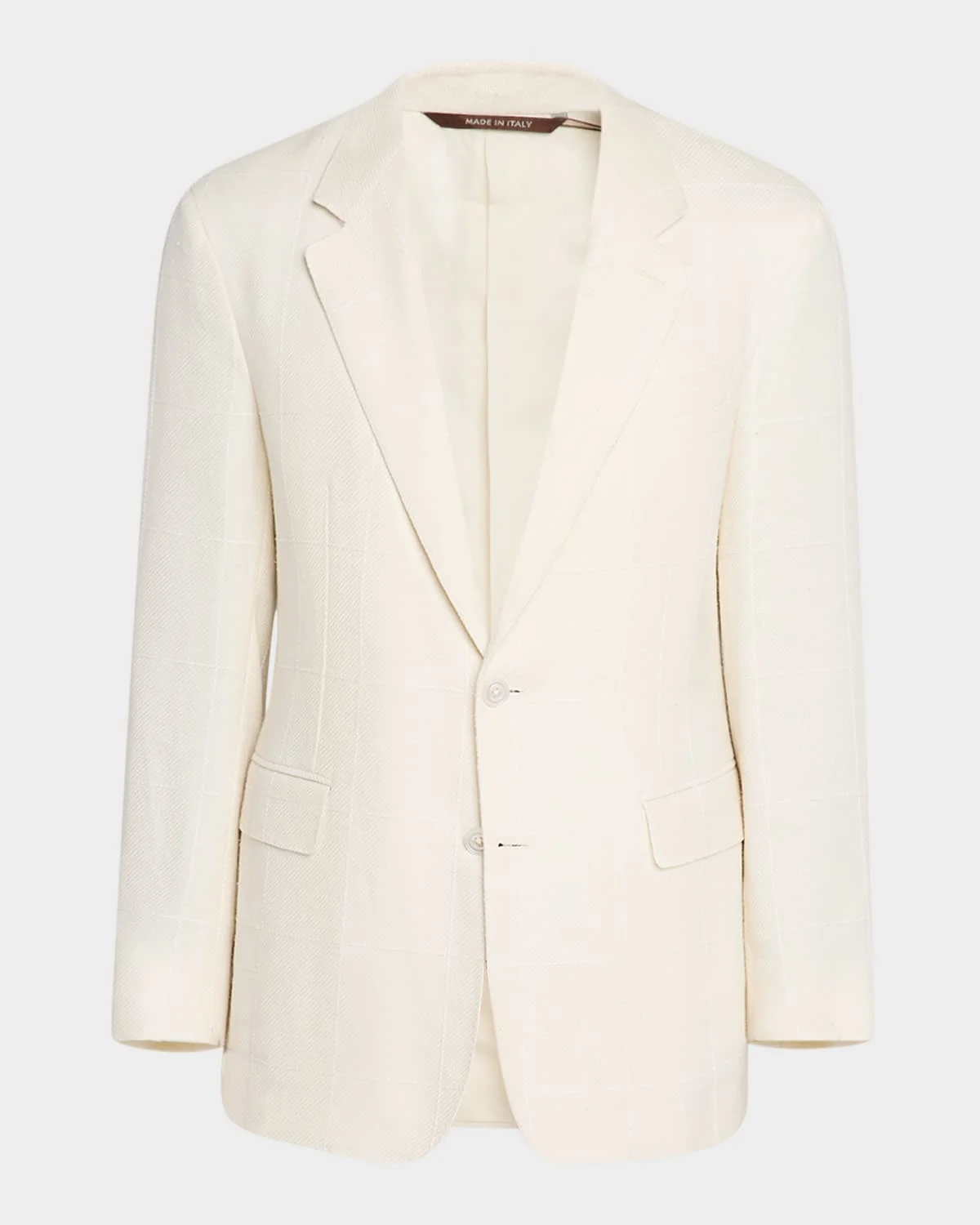- Canali sport coat in textured windowpane check - Notched lapels - Two-button closure - Chest welt pocket - Hip flap pockets - Four-button sleeve finish - Double-vented back - Linen/silk/wool - Lining: Rayon - Dry clean - Made in Italy