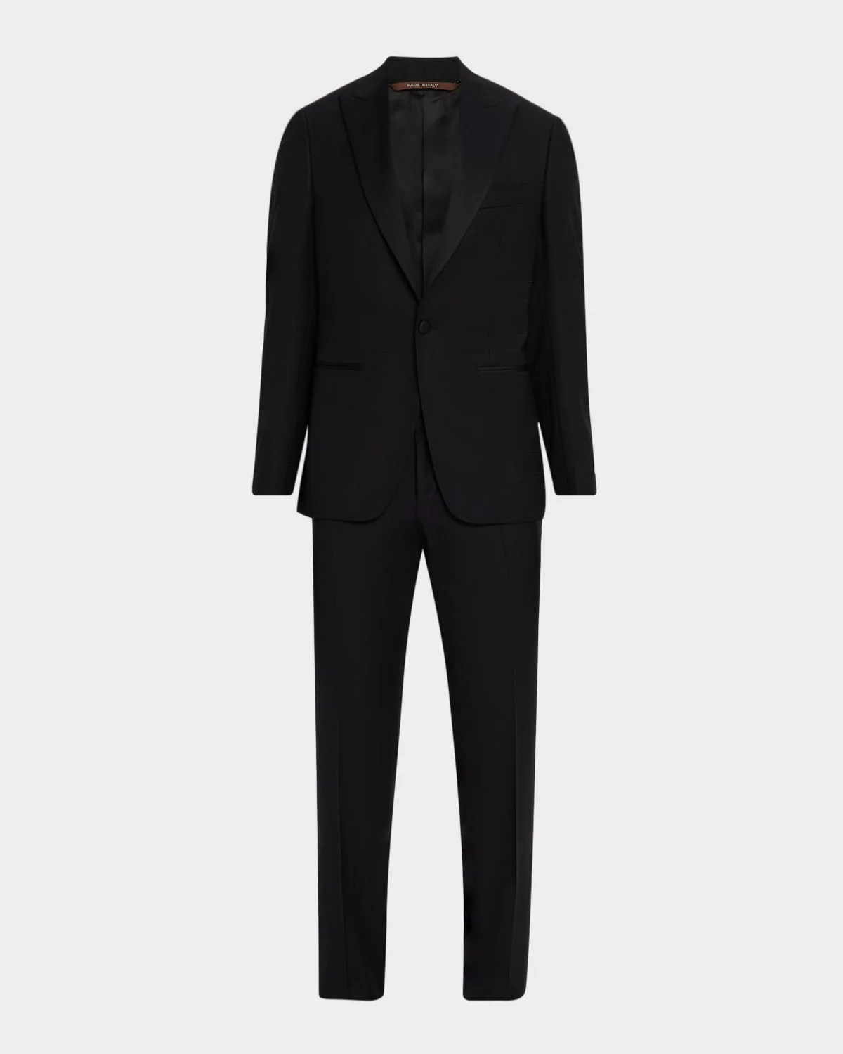 - Canali two-piece suit in textured wool, accented with smooth, tonal trims for a subtle contrast - Classic fit - Wool - Lining: Cupro - Dry clean - Made in Italy - Jacket: - Peak lapels - Single-breasted front - Barchetta chest pocket - Hip besom pockets - Internal breast pocket - Double-vented back - Trousers: - Regular rise - Flat front - Side slip pockets - Straight legs - Unfinished hem to be tailored to desired length