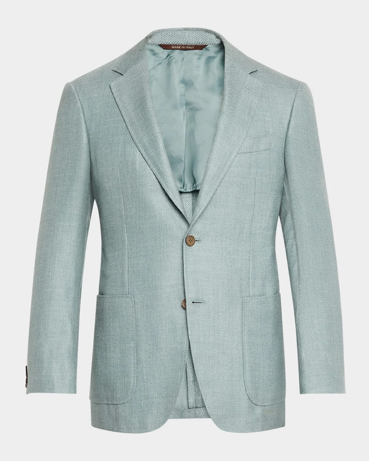 - Canali blazer in luxurious twill - Notch lapels; buttonhole at left lapel - Two-button closure - Chest welt pocket - Hip patch pockets - Interior double welt pocket - Four-button sleeve finish - Double-vented back - Wool/silk/linen - Lining: Rayon - Dry clean - Made in Italy