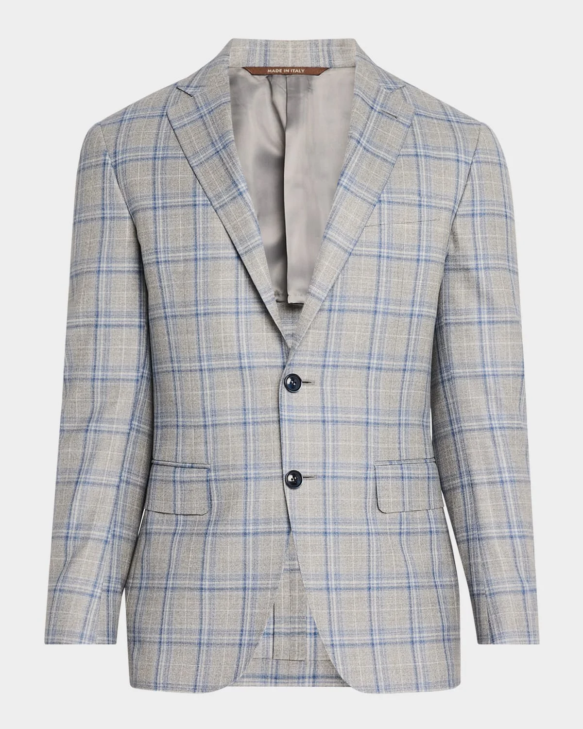 - Canali sport coat in two-tone plaid - Notched lapels - Two-button closure - Chest welt pocket - Hip flap pockets - Unfinished sleeves - Double-vented back - Wool - Lining: Rayon - Dry clean - Made in Italy