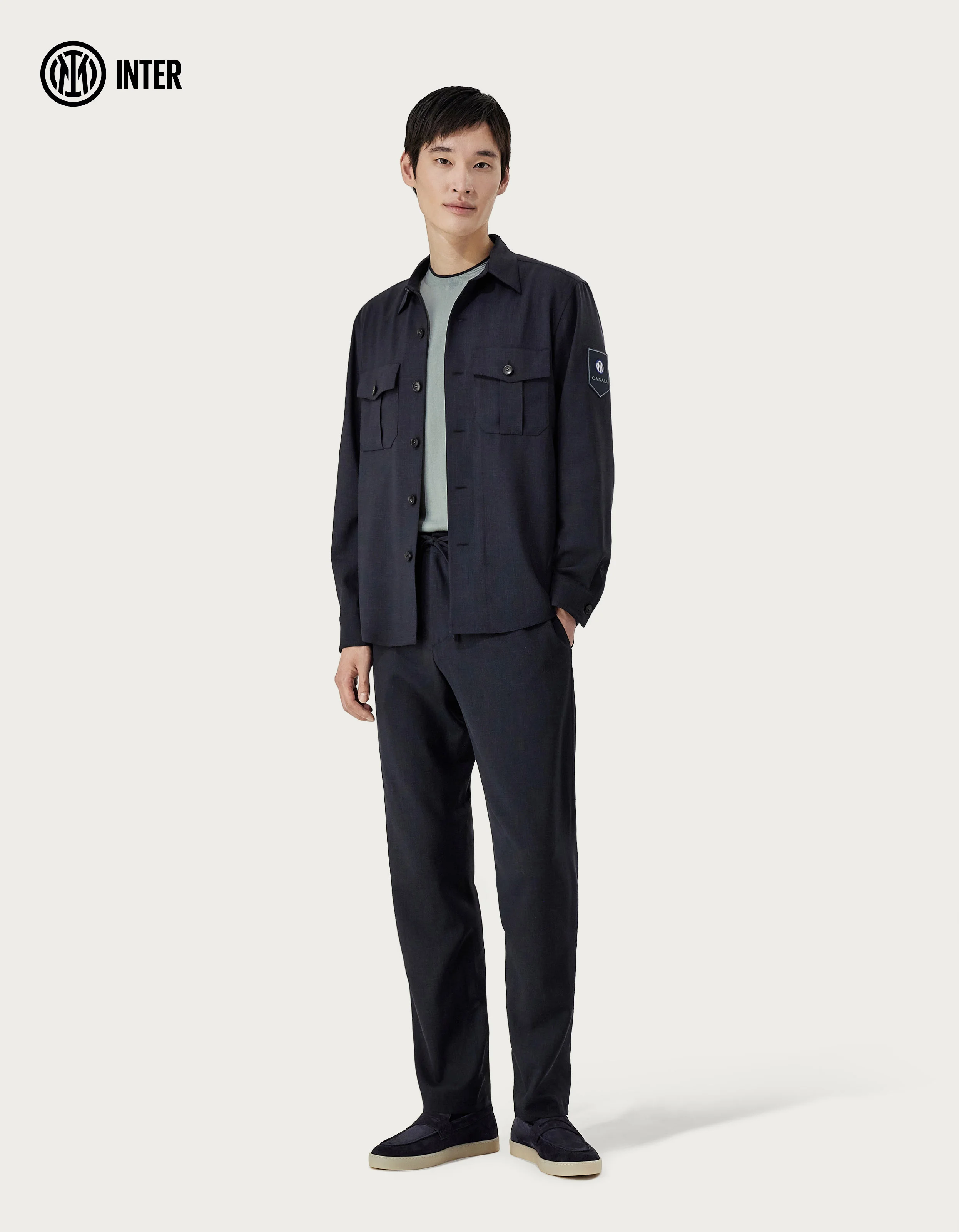 Part of the capsule collection developed by Canali for Inter Milan and made of wool, silk and linen canvas, this shirt jacket embodies contemporary elegance. Embellished with Inter Milan patches and the Canali logo, it features a dynamic fit and a refined silhouette, perfect for travel without compromising on style or comfort. FABRICS AND CRAFTSMANSHIP - Shirt Jacket - Front with 5+1 buttons - Patch chest pockets with motif, flap and button - Cuff and button at the end of the sleeves - Jacket length 75 cm in size 50 - Inter Milan patch on sleeve - Canali & Inter inside labels - 71% wool 15% silk 14% linen - Made in Italy CARE Do not wash with water Do not bleach Normal steam or dry iron on low (150°) Dry clean with perchlorethylene Do not tumble dry FIT Relaxed fit Shirt jacket featuring a more relaxed fit around the shoulders, waist and length The model wears a size 48. The model's measurements are: Height: 74.8 inches (190 cm) Chest: 36.2 inches (92 cm) Waist: 29.5 inches (75 cm) Hips: 36.2 inches (92 cm)