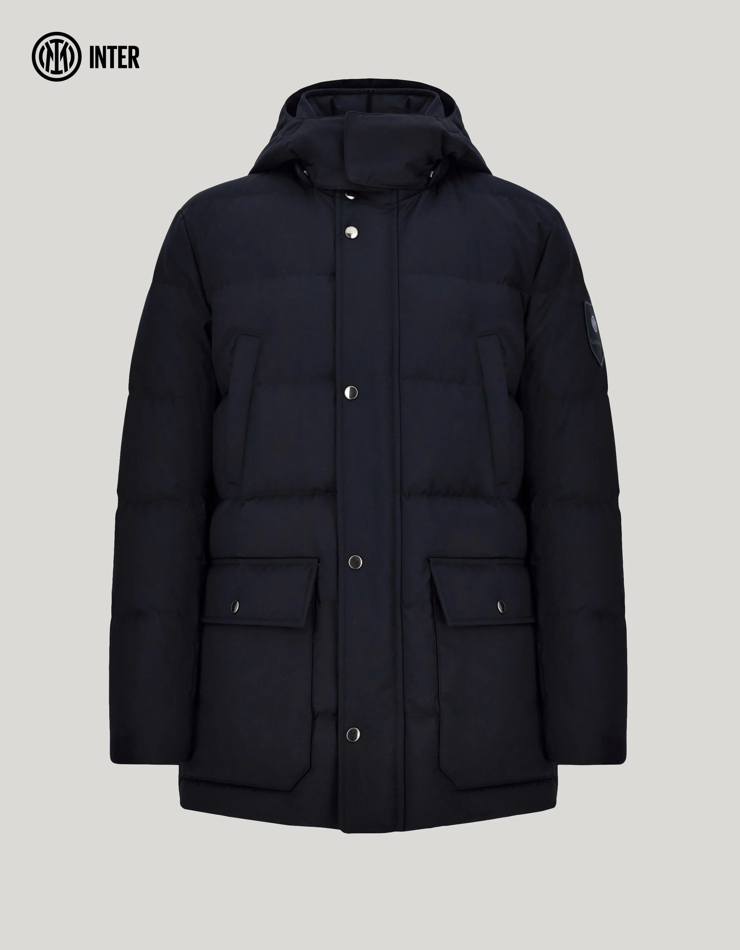 Viscose-blend down jacket with detachable hood, featuring refined details such as real leather pullers, double-entry patch pockets and real down padding. Part of the capsule collection developed by Canali for Inter and embellished with the Inter patch and Canali logo, it is a lined garment that celebrates the meeting of two icons of Made in Italy on the global stage. FABRICS AND CRAFTSMANSHIP - Down Jacket with "stand-up collar" and tailored sleeves - Horizontal quilting - Detachable hood - Central fastening with snap fasteners and concealed central double-slider zip with leather zip puller - Slanted handwarmer pockets - Double-entry patch pockets - Padded with real down - Genuine leather tag - Arrow patch with Canali logo and Inter coat of arms - Lined garment - Internal pocket with zip - Internal patch pockets - 70% polyester, 30% viscose - Made in Italy CARE Do not wash with water Do not bleach Do not iron Gentle dry clean with hydrocarbon solvents Do not tumble dry FIT The model is wearing a size 50 The model measures: Height: 185 cm (72.8 in) Chest: 100 cm (39.4 in) Waist: 79 cm (31.1 in) Hips: 95 cm (37.4 in)