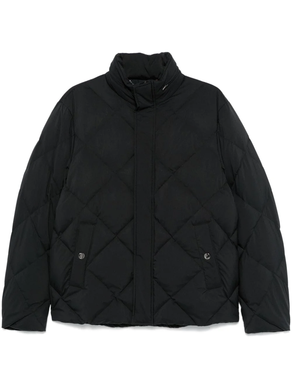 quilted jacket Highlights - Black - Goose down - Padded design - Diamond quilting - Front press-stud and zip fastening - High neck - Concealed hood - Long sleeves - Two press-stud fastening side pockets - Internal zip-fastening pocket - Internal patch pocket - Full lining - Straight hem Made in Italy Composition Outer: Polyester 100%, Polyurethane 100%, Leather 100% Lining: Polyester 100%, Polyurethane 100%, Goose Down 90%, Duck Feathers 10% SIZE & FIT Model measurements Height 6 ft 2 in(1.87 m) Bust/Chest 37.79 in(96 cm) Hips 37.79 in(96 cm) Waist 30.31 in(77 cm) FittingInformation Designed for a regular fit, allowing for a comfortably loose fit throughout the body Made from a quilted non-stretch fabric, giving it no natural elasticity