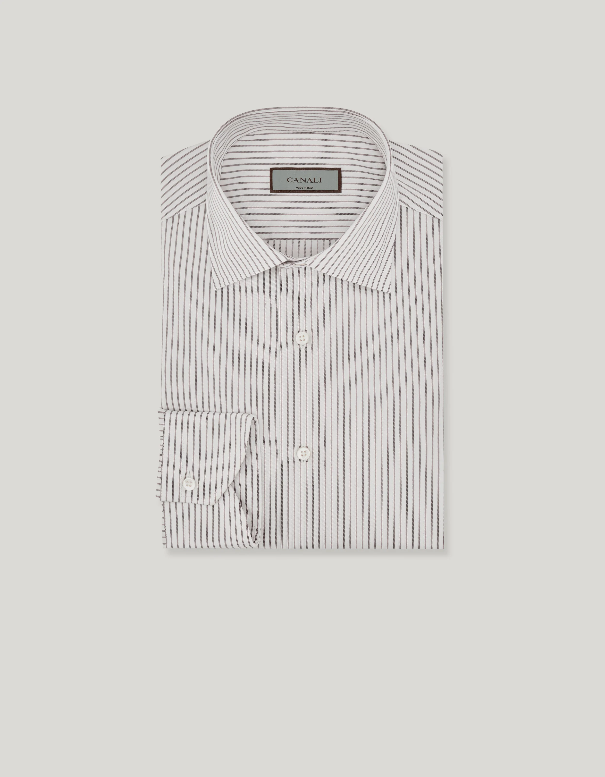 This dress shirt is made from Impeccabile cotton – a high-quality fabric that offers a truly flawless look – in a timeless and elegant dual-tone colour scheme. In the understated lines of the regular fit, this piece features a refined striped pattern and an understated design with a semi-spread collar, but no placket or darts. For businessmen who want to create elegant looks for important occasions. FABRICS AND CRAFTSMANSHIP - Dress shirt - Impeccabile fabric - Semi-spread collar - Collar height: 4.2 cm - Removable stays - Smooth back with no darts - Smooth front with no placket - Semi-rounded cuffs - 100% cotton - Made in Italy CARE Machine wash max 30° Do not bleach Normal steam or dry iron on low (110°) Do not dry clean Do not tumble dry FIT Regular Fit The model is wearing a size 48 The model measures: Height: 190 cm Chest: 92 cm Waist: 75 cm Hips: 92 cm