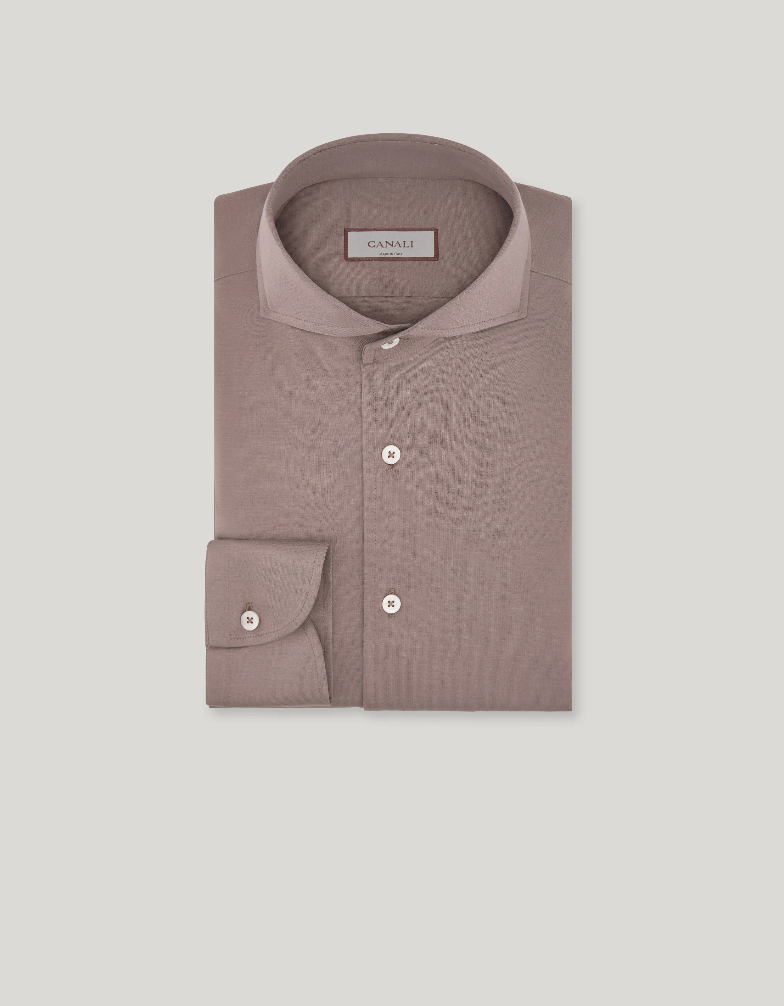 Casual cotton jersey shirt with a cutaway collar, distinguished by a contemporary colour scheme and the comfortable lines of the regular fit, which accompany the body's movements in complete comfort. A garment with a clean design, without no placket on the front, for the man who combines elegance and versatility. FABRICS AND CRAFTSMANSHIP - Casual shirt - Cutaway collar - Collar height: 3.8 cm - Smooth front with no placket - 100% cotton - Jersey - Made in Italy CARE Machine wash max 30° - delicate cycle Do not bleach Normal steam or dry iron on low (110°) Do not dry clean Dry flat FIT Regular Fit The model is wearing a size 48 The model measures: Height: 188 cm Chest: 94 cm Waist: 75 cm Hips: 93 cm