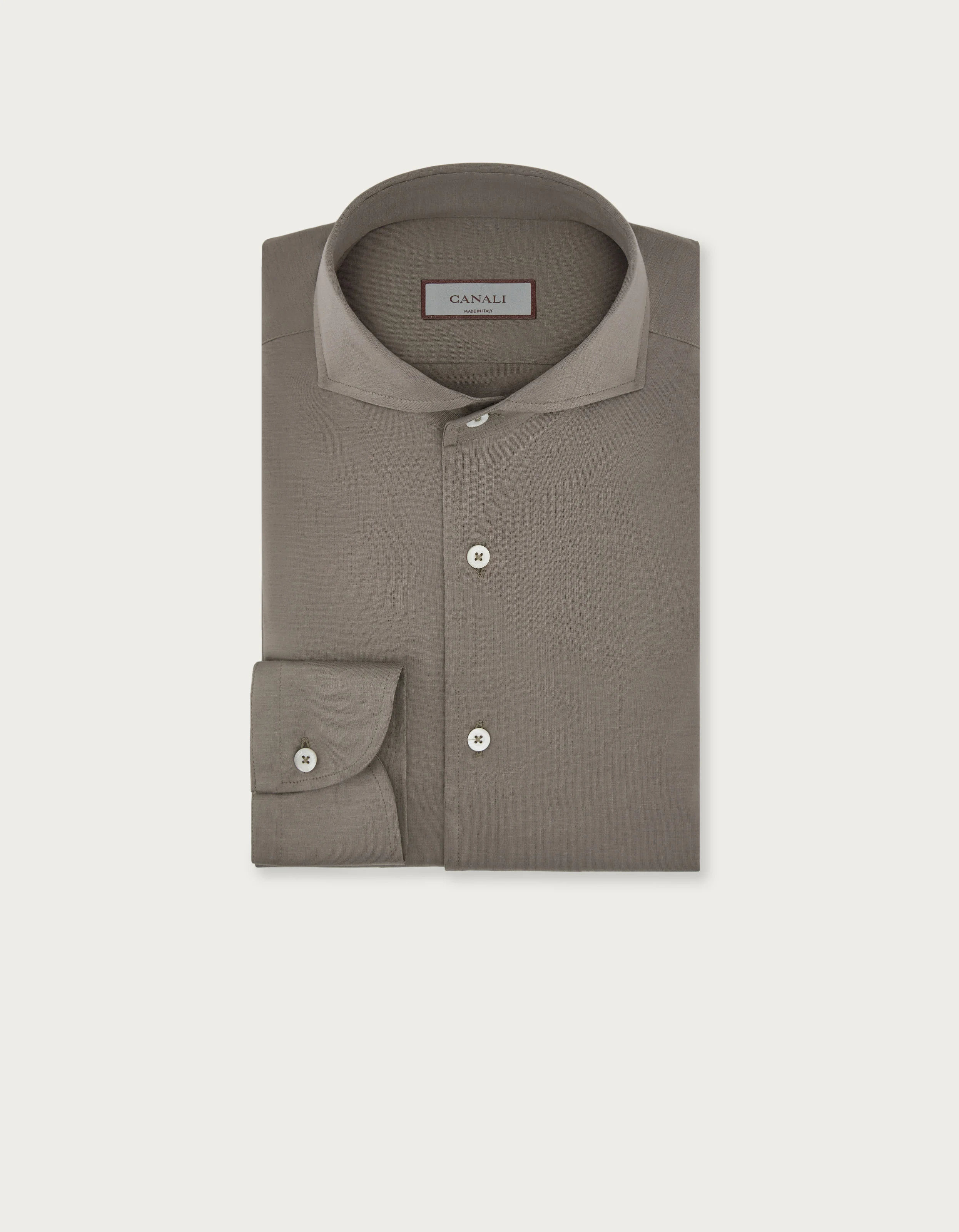 Casual cotton jersey shirt with a cutaway collar, distinguished by a contemporary colour scheme and the comfortable lines of the regular fit, which accompany the body's movements in complete comfort. A garment with a clean design, without no placket on the front, for the man who combines elegance and versatility. FABRICS AND CRAFTSMANSHIP - Casual shirt - Cutaway collar - Collar height: 3.8 cm - Smooth front with no placket - 100% cotton - Jersey - Made in Italy CARE Machine wash max 30° - delicate cycle Do not bleach Normal steam or dry iron on low (110°) Do not dry clean Dry flat FIT Regular Fit The model is wearing a size 48 The model measures: Height: 188 cm Chest: 94 cm Waist: 75 cm Hips: 93 cm