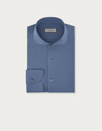 Casual cotton jersey shirt with a cutaway collar, distinguished by a contemporary colour scheme and the comfortable lines of the regular fit, which accompany the body's movements in complete comfort. A garment with a clean design, without no placket on the front, for the man who combines elegance and versatility. FABRICS AND CRAFTSMANSHIP - Casual shirt - Cutaway collar - Collar height: 3.8 cm - Smooth front with no placket - 100% cotton - Jersey - Made in Italy CARE Machine wash max 30° - delicate cycle Do not bleach Normal steam or dry iron on low (110°) Do not dry clean Dry flat FIT Regular Fit The model is wearing a size 48 The model measures: Height: 188 cm Chest: 94 cm Waist: 75 cm Hips: 93 cm