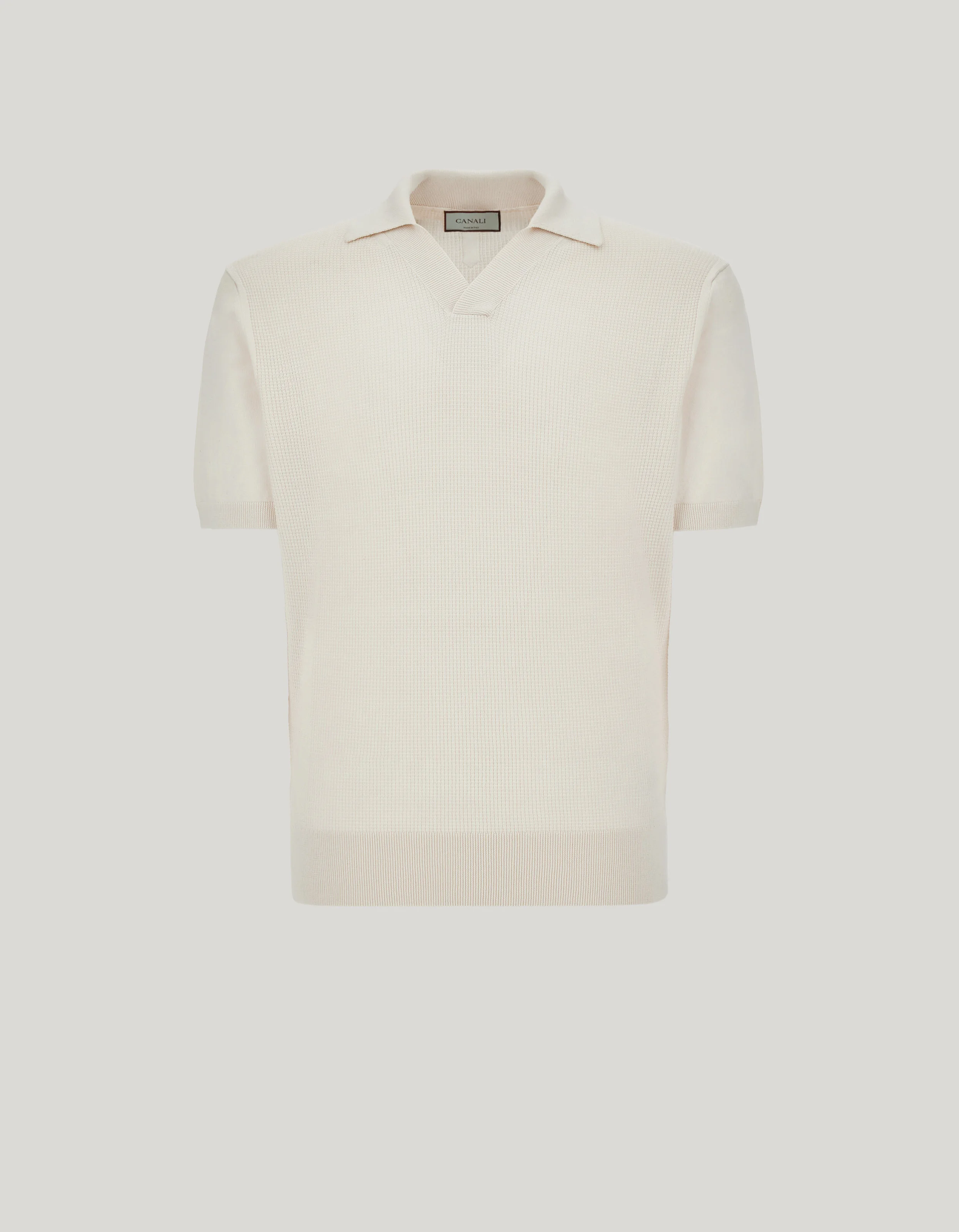 Short-sleeved polo shirt in a refined and practical style. Made from a fine cotton and silk blend, it has a delicate micro-texture on the body and shaved sleeves. In addition to the fine materials, the polo shirt excels in versatility, guaranteeing extreme comfort. A must-have garment for men seeking a combination of elegance and practicality. FABRICS AND CRAFTSMANSHIP - Short-sleeved open-collar polo shirt - Ribbed collar, hem and cuffs - Structured and shaved - 18 gauge - 80% cotton, 20% silk - Made in Italy CARE Hand wash max 40° Do not bleach Normal steam or dry iron on low (110°) Gentle dry clean with perchlorethylene Dry flat FIT The model is wearing a size 50 The model measures: Height: 185 cm Chest: 100 cm Waist: 79 cm Hips: 95 cm