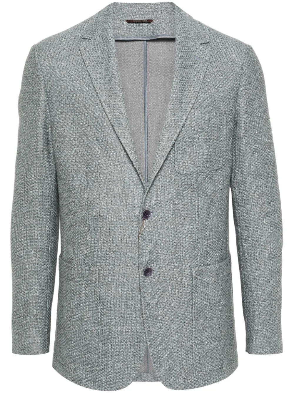 single-breasted blazer Highlights - Blue-grey - Linen-cotton blend - Interlock weave - Notched lapels - Long sleeves - Faux buttoned cuffs - Chest patch pocket - Two front patch pockets - English rear vents - Multiple internal slip pockets - Internal logo patch - Partial lining - Front button fastening Made in Italy Composition Outer: Linen/Flax 65%, Cotton 35% Polyester 100% Lining: Acetate 65%, Polyester 35% SIZE & FIT Model measurements Height 6 ft 1 in(1.86 m) Bust/Chest 37.4 in(95 cm) Hips 36.22 in(92 cm) Waist 29.52 in(75 cm) FittingInformation Designed for a slim fit, offering a comfortable fit that sits just away from the body The vented hem offers movement at the rear Made from a midweight non-stretch fabric This piece fits true to size – take your usual size Washing instructions Dry Clean Only