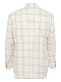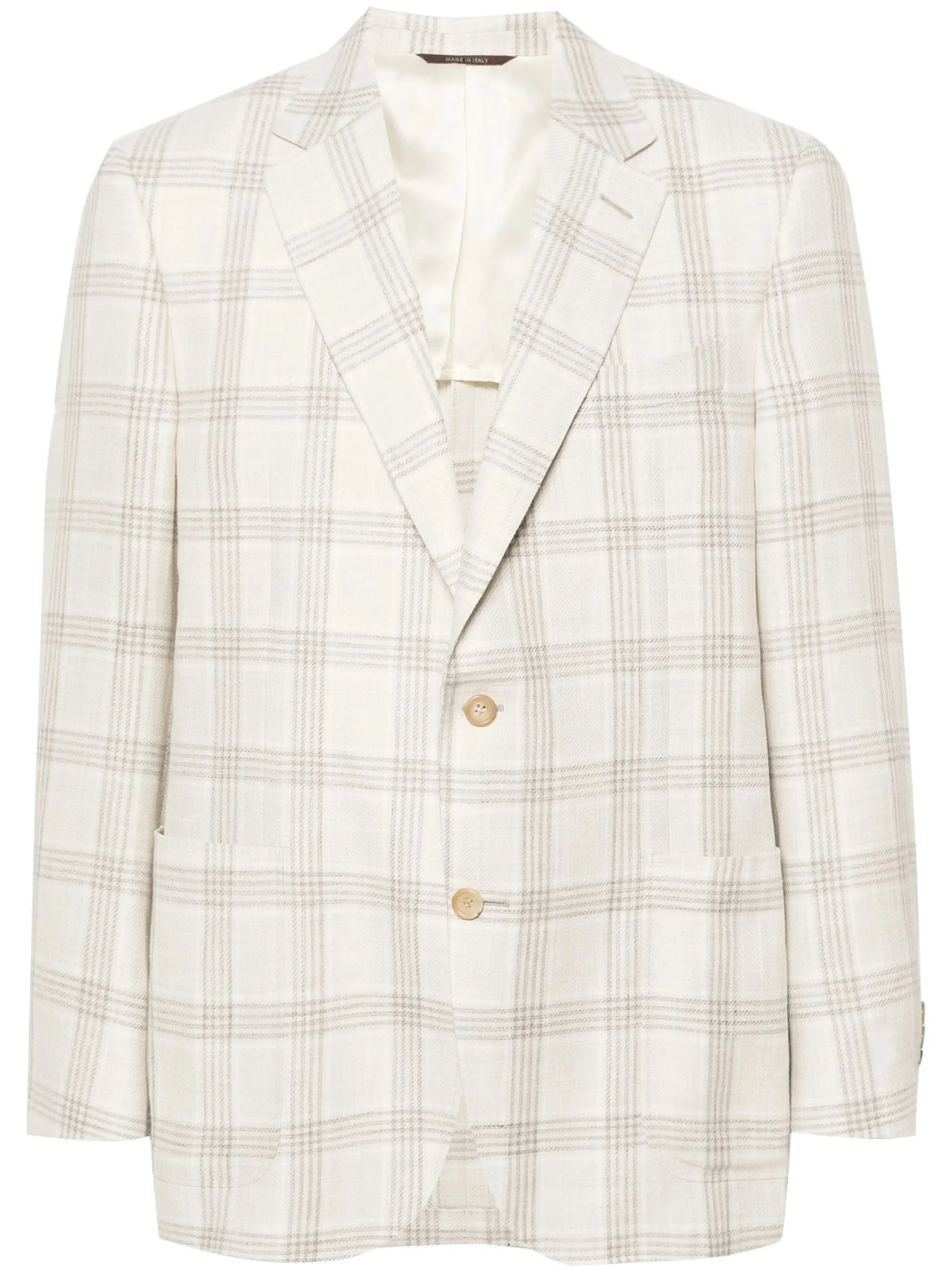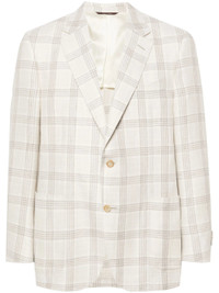 ivory white/grey linen-wool blend plaid check pattern twill weave notched lapels long sleeves with buttoned cuffs chest welt pocket two side patch pockets English rear vents multiple internal slip pockets internal logo patch curved hem front button fastening - Color: NEUTRALS - Made in: Italy - Designer Style ID: CF02005 21288 706 Composition and care Outer Composition Linen/flax: 60.0%, Lining Composition Cupro: 100.0%, Outer Composition Wool: 40.0%