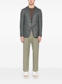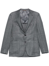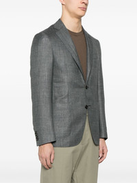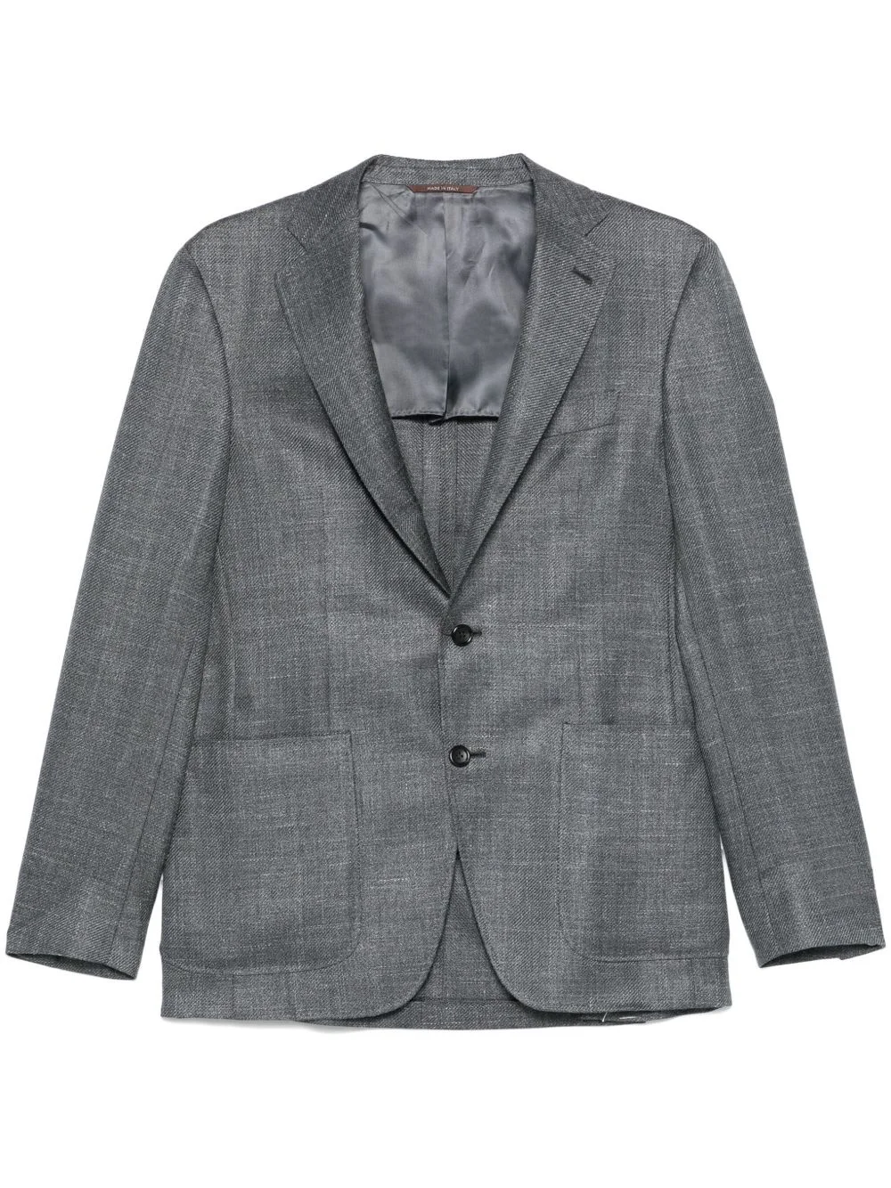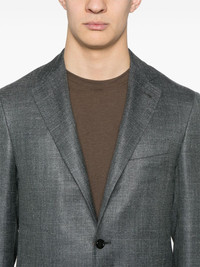 single-breasted blazer Highlights - Slate grey - English rear vents - Buttoned-cuff sleeves - Chest welt pocket - Two front patch pockets Made in Italy Composition Outer: Wool 65%, Silk 21%, Linen/Flax 14% Lining: Cupro 100% SIZE & FIT Model measurements Height 6 ft 1 in(1.86 m) Bust/Chest 36.61 in(93 cm) Hips 37 in(94 cm) Waist 28.74 in(73 cm) FittingInformation Designed for a slim fit, offering a comfortable fit that sits just away from the body The vented hem offers movement at the rear Made from a midweight non-stretch fabric