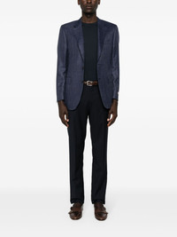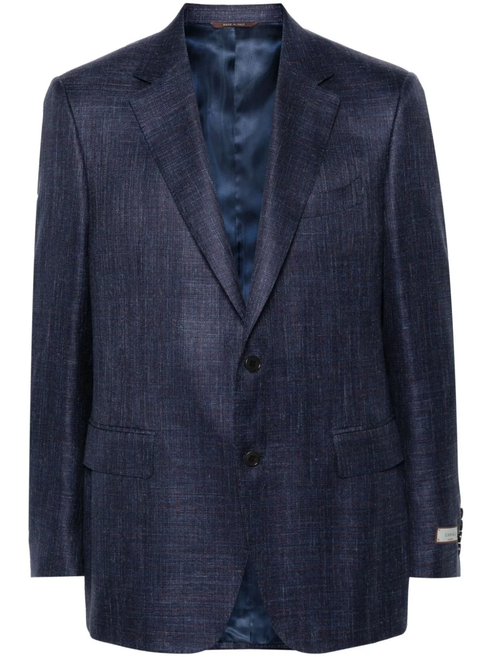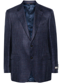 single-breasted blazer Highlights - Navy blue - Wool blend - Interlock weave - Micro-check pattern - Notched lapels - Long sleeves - Faux buttoned-cuff sleeves - Chest welt pocket - Two side flap pockets - English rear vents - Multiple internal slip pockets - Full lining - Front button fastening Made in Italy Composition Outer: Wool 68%, Silk 20%, Linen/Flax 12% Lining: Cupro 100% SIZE & FIT Model measurements Height 6 ft 2 in(1.87 m) Bust/Chest 36.41 in(92.5 cm) Hips 37 in(94 cm) Waist 29.52 in(75 cm) FittingInformation Designed for a slim fit, offering a comfortable fit that sits just away from the body The internal shoulder pads offer a structured shape Made from a midweight non-stretch fabric This piece fits true to size – take your usual size Washing instructions Dry Clean Only