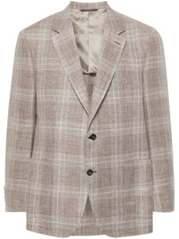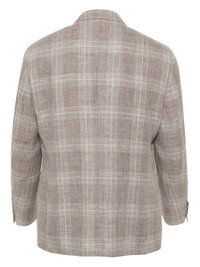 light brown/white linen-wool blend plaid check pattern notched lapels long sleeves with buttoned cuffs logo patch at the sleeve chest welt pocket two side patch pockets English rear vents multiple internal slip pockets internal logo patch curved hem front button fastening Size & Fit Model Measurements: Bust: 0cm Height: 0cm Hips: 0cm Waist: 0cm