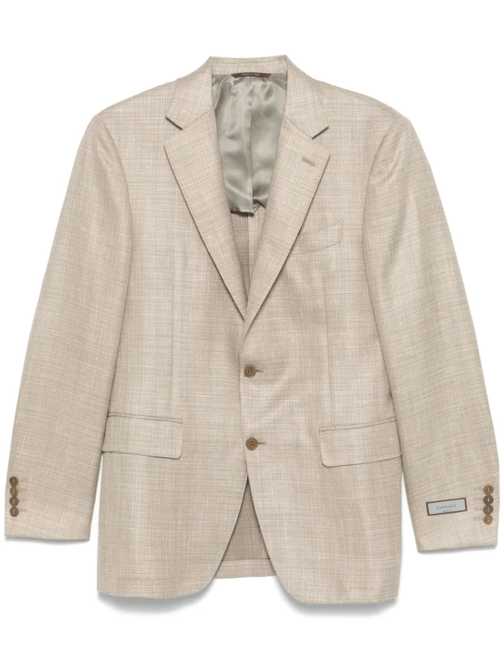 single-breasted blazer Highlights - Light beige - Front button fastening - Chest welt pocket - Two side flap pockets - Buttoned-cuff sleeves Made in Italy Composition Outer: Wool 68%, Silk 20%, Linen/Flax 12% Lining: Cupro 100% SIZE & FIT Model measurements Height 6 ft 1 in(1.85 m) Bust/Chest 35.82 in(91 cm) Hips 37.79 in(96 cm) Waist 29.13 in(74 cm) FittingInformation Designed for a slim fit, offering a comfortable fit that sits just away from the body The vented hem offers movement at the rear Made from a midweight non-stretch fabric
