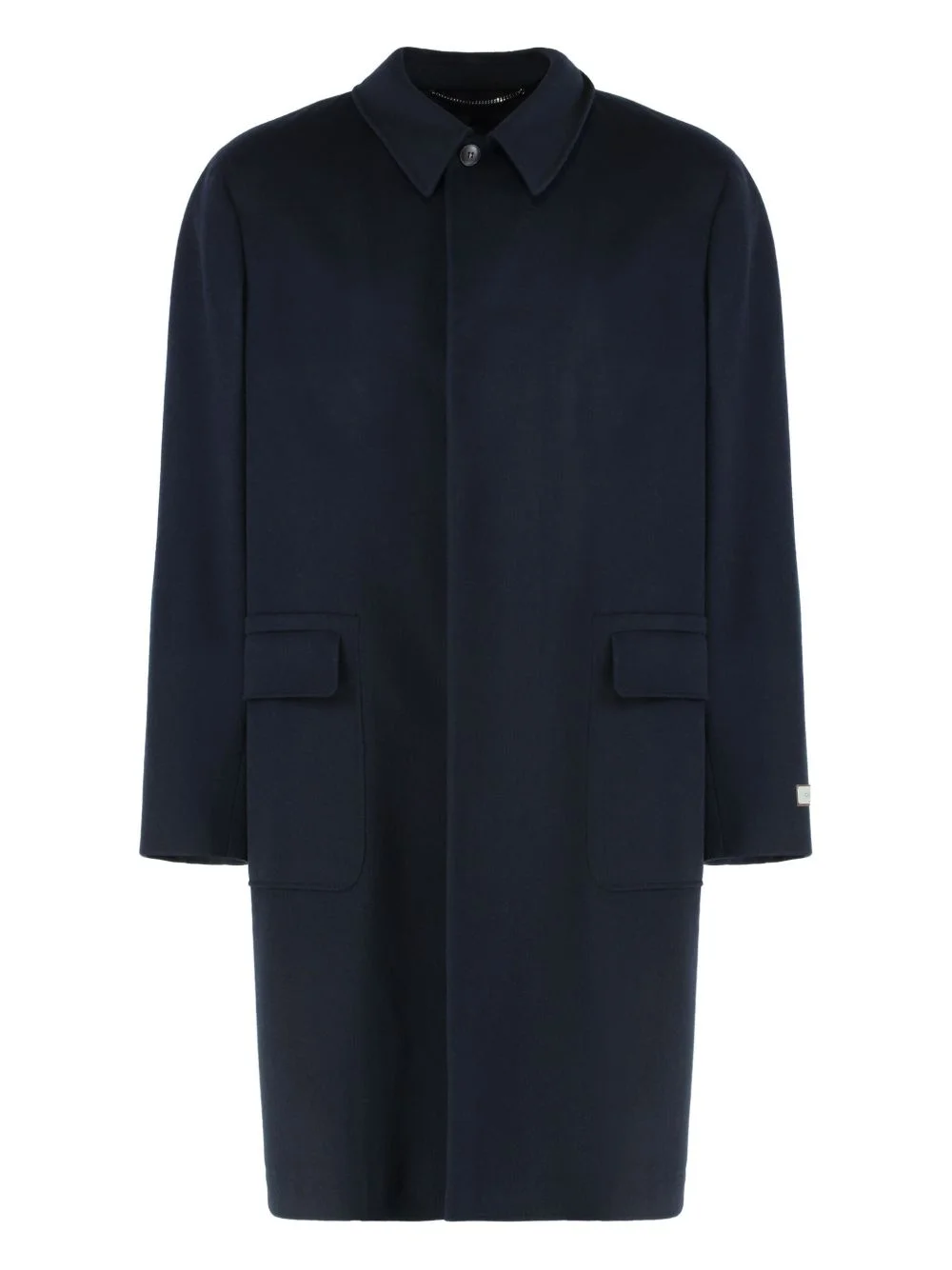 single-breasted wool coat Highlights - Navy blue - Classic collar - Flap pockets - Minimalist design - Long sleeves - Front button fastening Made in Italy Composition Wool 100% Washing instructions Read Manufacturer Guidelines