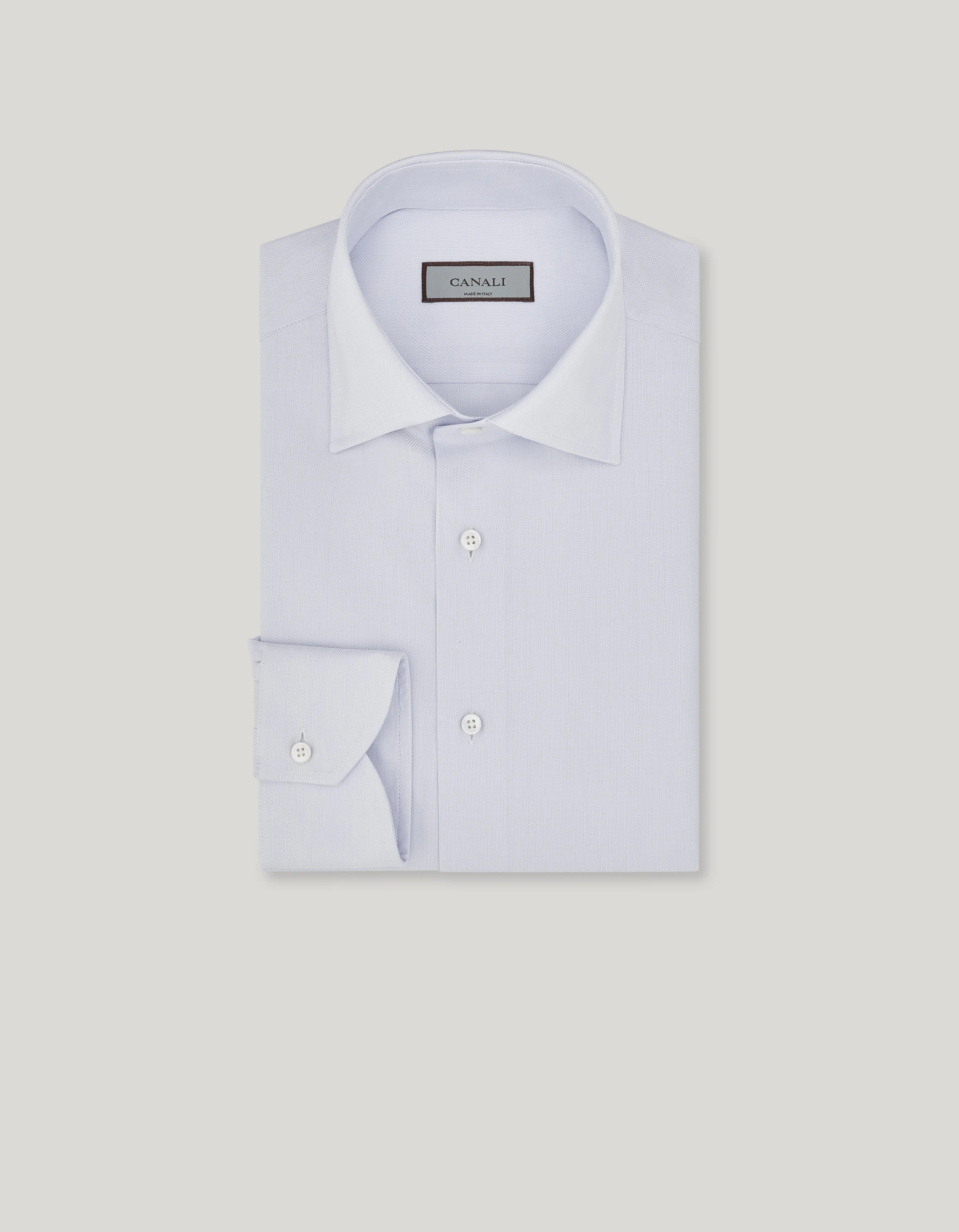 Impeccabile shirt in herringbone motif twill cotton, a high-quality fabric whose ability to resist wrinkles gives a consistently flawless look. This elegant regular fit piece enhances the figure with its perfect balance of comfort and style thanks to the superior fabric and refined collar. The curated design promises impeccable practicality for any occasion, whether in the office or at formal events, while maintaining a sleek, contemporary presence. Elegance and functionality come together in a must-have shirt for the modern man. FABRICS AND CRAFTSMANSHIP - Formal shirt - Impeccabile - Semi-spread collar - Collar height 4.2 cm - Removable collar stiffeners - Plain back with no wrinkles - Plain front with no placket - Semi-rounded cuff - 100% Cotton - Made in Italy CARE Machine wash max 30° - delicate cycle Do not bleach Normal steam or dry iron on low (110°) Gentle dry clean with perchlorethylene Do not tumble dry FIT Regular fit The model is wearing a size 48 The model measures: Height: 186 cm (73.2 in) Chest: 81 cm (31.9 in) Waist: 70 cm (27.6 in) Hips: 82 cm (32.3 in)