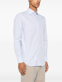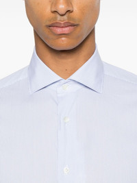 striped shirt Highlights - Ocean blue/white - Cotton blend - Poplin texture - Vertical stripe pattern - Front button fastening - Cutaway collar - Long sleeves - Pleat detailing at the sleeves - Buttoned cuffs - Unlined - Curved hem Made in Italy Composition Cotton 74%, Polyamide 23%, Elastane 3% SIZE & FIT Model measurements Height 6 ft 2 in(1.87 m) Bust/Chest 38.18 in(97 cm) Hips 36.61 in(93 cm) Waist 29.13 in(74 cm) FittingInformation Designed for a slim fit, offering a comfortable fit that sits just away from the body Made from a lightweight stretch fabric, this piece offers elasticity and flexibility when worn