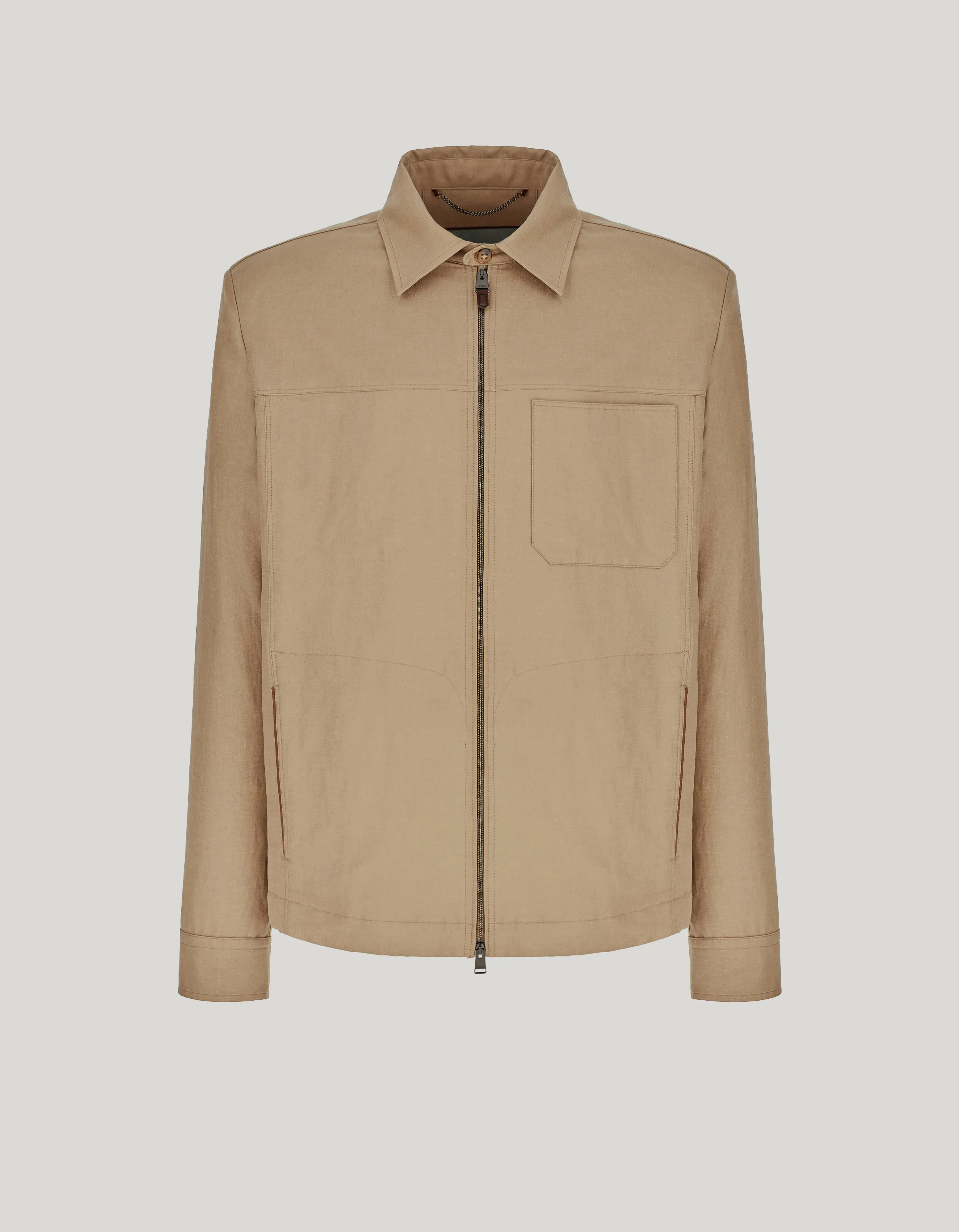 Refined and versatile, the jacket is made from an exclusive blend of linen and silk, ideal for the masculine wardrobe defined by casual elegance. The suede elements and curated details, such as the two-way zip and the inside pocket, make it perfect for a casual yet sophisticated look. A masterpiece of made-in-Italy craftsmanship, this jacket is a must-have for those who appreciate fine workmanship and uncompromising practicality. FABRICS AND CRAFTSMANSHIP - Shirt collar jacket - Central two-way zip with leather zip pull - Patch chest pocket - Hand pockets at the sides - Elasticated hem - Buttoned cuffs - Suede details - Genuine leather tag - Unlined garment - Inside patch pocket - 57% linen, 43% silk - Made in Italy CARE Do not wash with water Do not bleach Do not iron Gentle dry clean with perchlorethylene Do not tumble dry FIT The model is wearing a size 50 The model measures: Height: 185 cm (72.8 in) Chest: 100 cm (39.4 in) Waist: 79 cm (31.1 in) Hips: 95 cm (37.4 in)