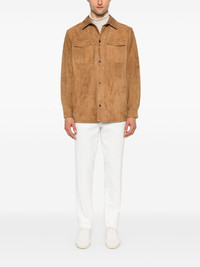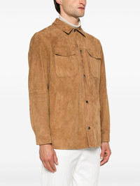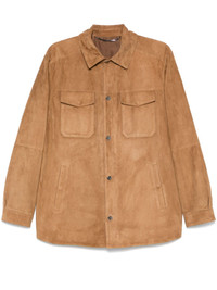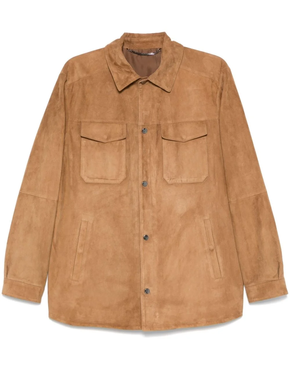suede shirt jacket Highlights - Camel brown - Lambskin - Suede - Front press-stud fastening - Classic collar - Long sleeves - Press-stud fastening cuffs - Two chest flap pockets - Two side welt pockets - Full lining - Straight hem Made in Italy Composition Lining: Polyester 100%, Cotton 100% Outer: Lamb Skin 100% SIZE & FIT Model measurements Height 6 ft 2 in(1.87 m) Bust/Chest 37.79 in(96 cm) Hips 37.79 in(96 cm) Waist 30.31 in(77 cm) FittingInformation Designed for a regular fit, allowing for a comfortably loose fit throughout the body Suede leather has a soft and treated construction offering some flexibility