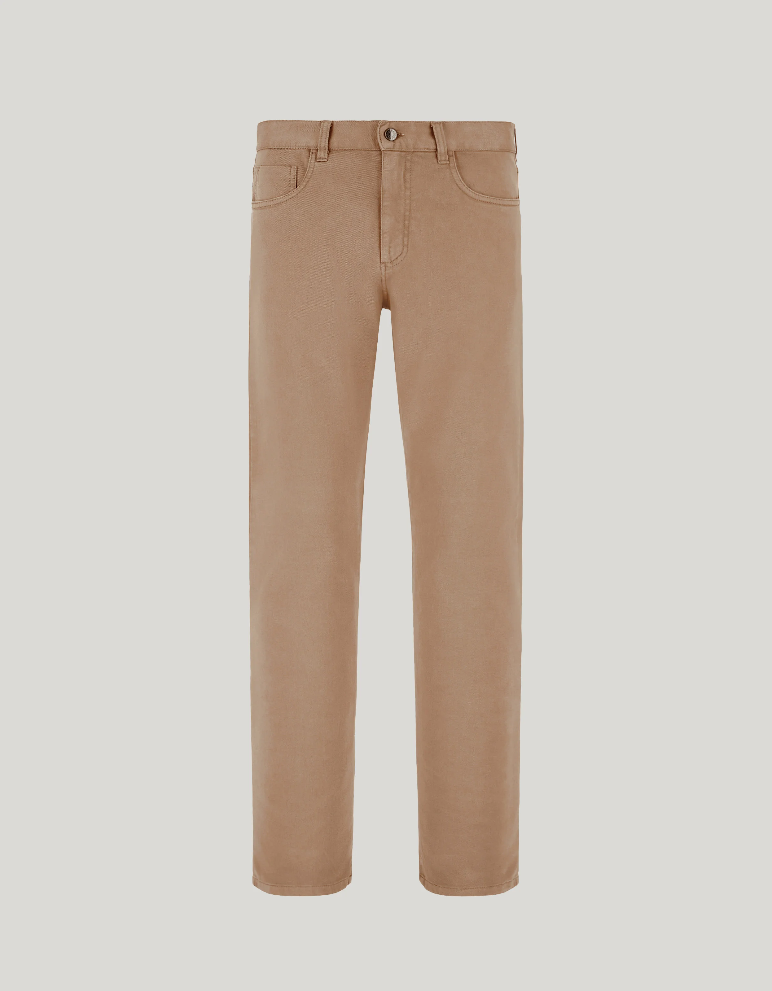 These chinos are made from garment-dyed cotton twill in a sophisticated colour scheme. The understated flat front design follows the comfortable lines of the regular fit, finished with refined details including the button tab fastening and rear double welt pockets with buttons. The ideal choice to add a touch of character to informal looks. FABRICS AND CRAFTSMANSHIP - 5-pocket pants - Regular Fit - Central fly with a branded metal button - Rear patch pockets - Washable genuine leather label on the back of the waistband - Hem width: 19.5 cm - Comfortable garment-dyed twill - 98% cotton, 2% elastane - Made in Italy CARE Machine wash max 30° - delicate cycle Do not bleach Normal steam or dry iron on low (110°) Gentle dry clean with perchlorethylene Do not tumble dry FIT Regular Fit The model is wearing a size 48 The model measures: Height: 188 cm Chest: 94 cm Waist: 75 cm Hips: 93 cm