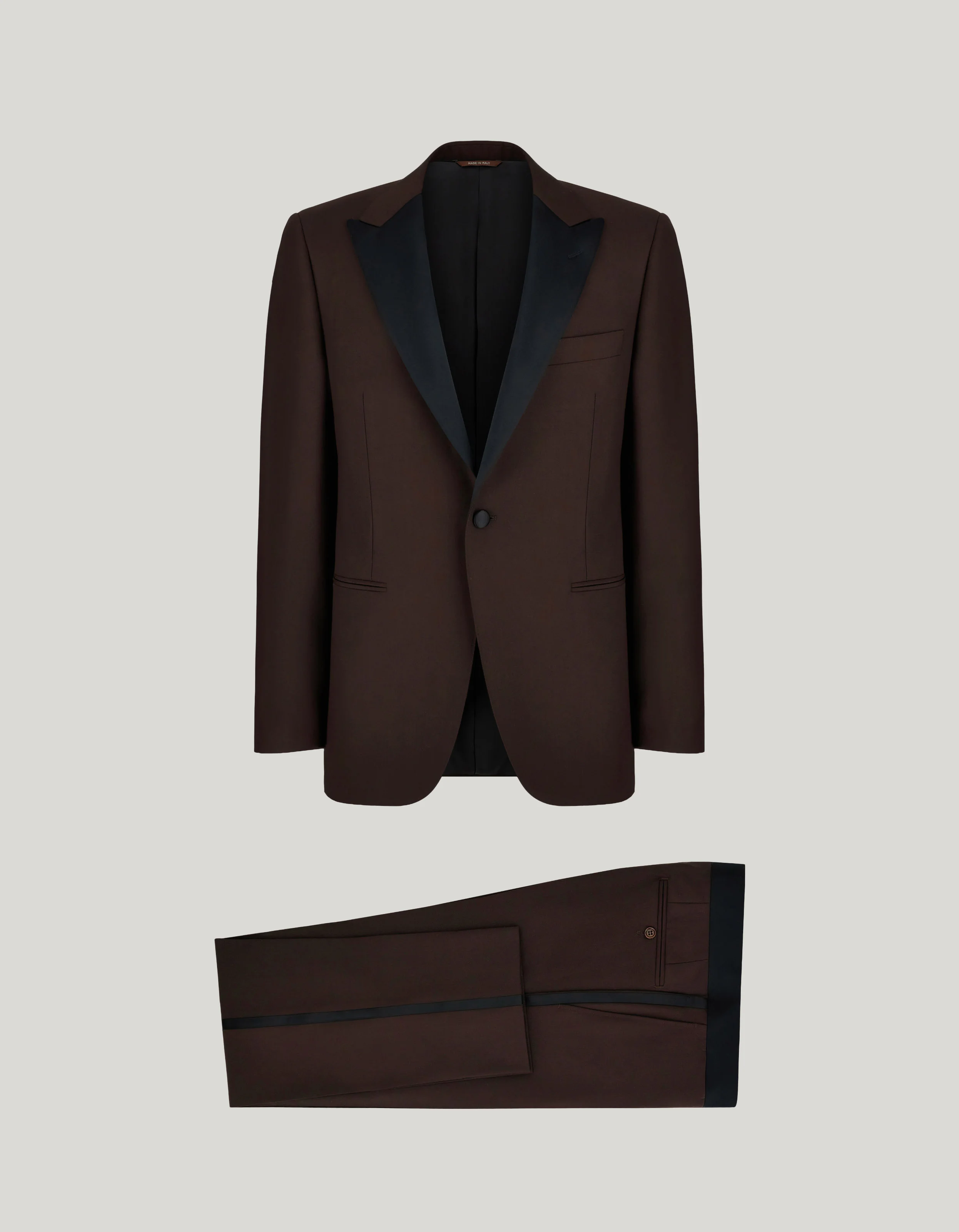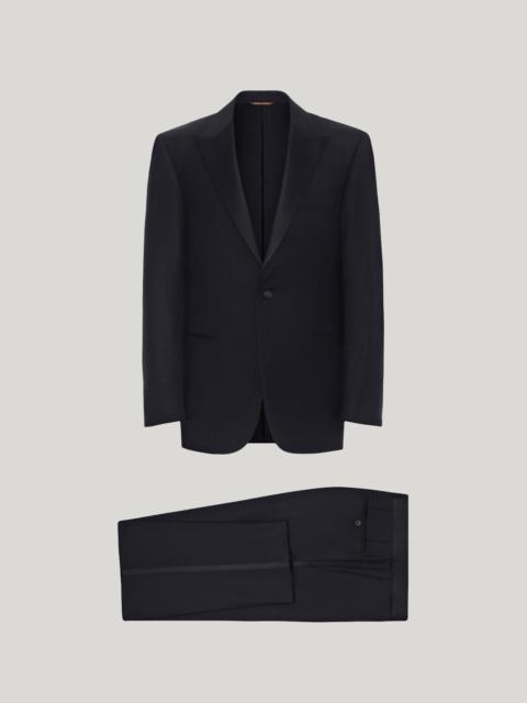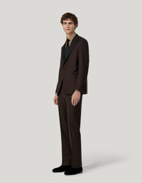 An expression of timeless charm and exclusivity, this pure wool dinner jacket is made in an original colour. Composed of a single-breasted jacket with a refined design, with pointed silk lapels, welt pockets and a slash pocket, and flat-front pants with a belt and a silk side band. A clean, elegant garment with understated lines and a regular fit, adding a sophiticated touch to any special occasion outfit. FABRICS AND CRAFTSMANSHIP - Single-breasted one-button dinner jacket - Pointed silk lapels - Pocket with trim and handkerchief pocket - Jacket length: 75 cm in size 50 - Flat-front trousers - Silk belt and silk band along the side - Slant pockets and two rear welt pockets - Cuff: 19.5 cm - 100% wool - Made in Italy CARE Do not wash with water Do not bleach Normal steam or dry iron on low (110°) Dry clean with perchlorethylene Do not tumble dry FIT Regular Fit - Drop 6 The contemporary Venezia jacket features a regular length with well-defined shoulders, light shoulder pads, and standard lapels. The soft pants feature a mid-rise waist and regular cuffs. The model is wearing a size 48 The model measures: Height: 190 cm Chest: 92 cm Waist: 75 cm Hips: 92 cm