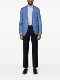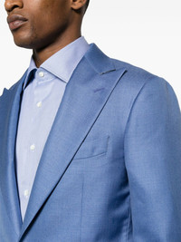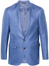twill melange blazer Highlights - Light blue - Cashmere-silk blend - Twill weave - Melange effect - Dart detailing - Peak lapels - Shoulder pads - Long sleeves - Buttoned cuffs - Chest welt pocket - Two front flap pockets - Multiple internal jetted pockets - Front button fastening - Curved hem - Full lining Made in Italy Composition Outer: Cashmere 60%, Silk 40% Lining: Cupro 100% SIZE & FIT Model measurements Height 6 ft 2 in(1.88 m) Bust/Chest 35.03 in(89 cm) Hips 35.82 in(91 cm) Waist 27.95 in(71 cm) FittingInformation Designed for a slim fit, offering a comfortable fit that sits just away from the body The internal shoulder pads offer a structured shape Made from a midweight non-stretch fabric This piece fits true to size – take your usual size