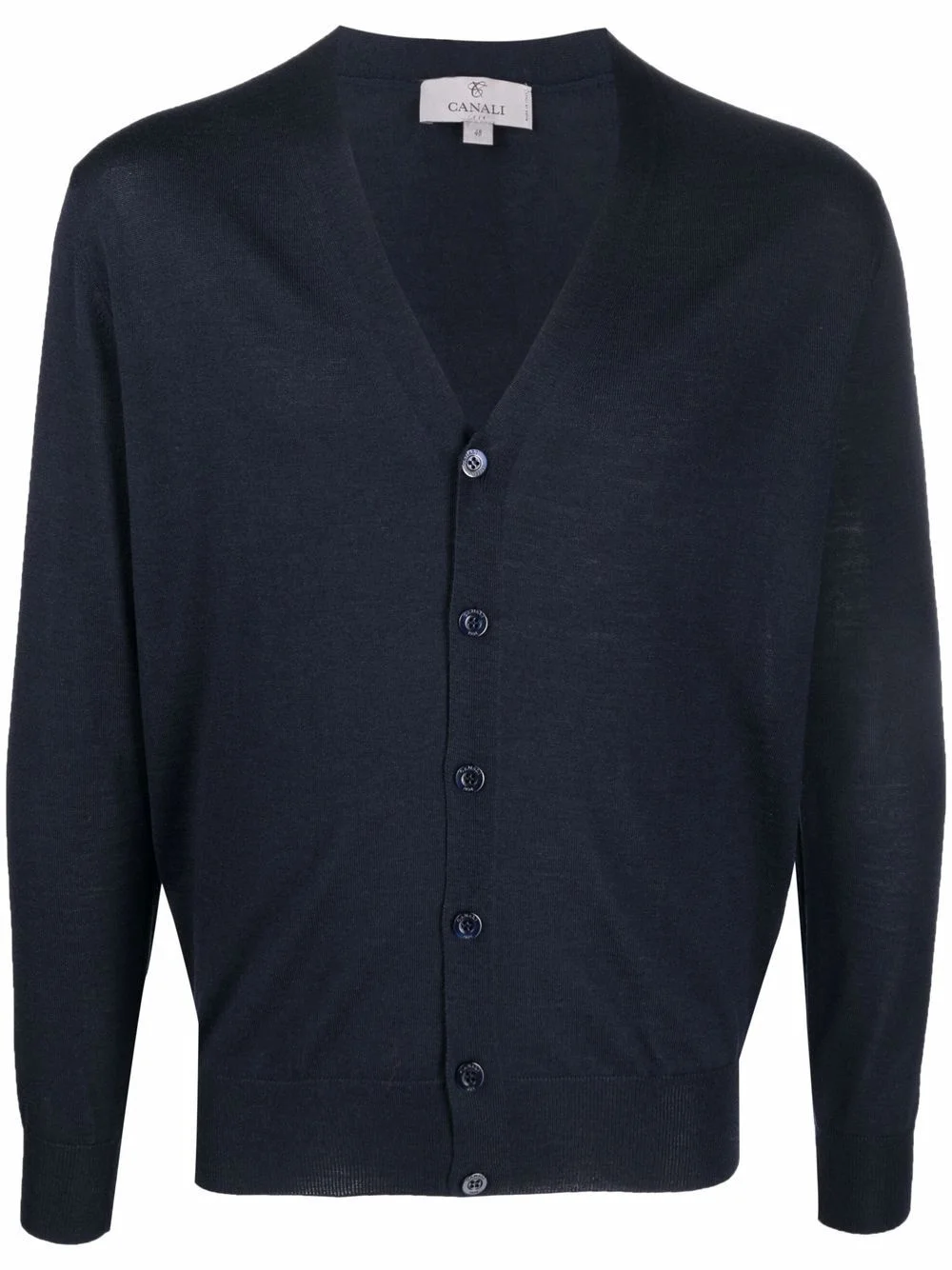 V-neck knitted cardigan navy blue merino fine knit V-neck front button fastening long sleeves straight hem Made in Italy Composition Merino 100% SIZE & FIT Model measurements Height 6 ft 2 in(1.89 m) Bust/Chest 37.79 in(96 cm) Hips 37 in(94 cm) Waist 29.92 in(76 cm) FittingInformation This piece fits true to size. We recommend you get your regular size Cut for a relaxed fit Made with a mid-weight fabric Washing instructions Hand Wash