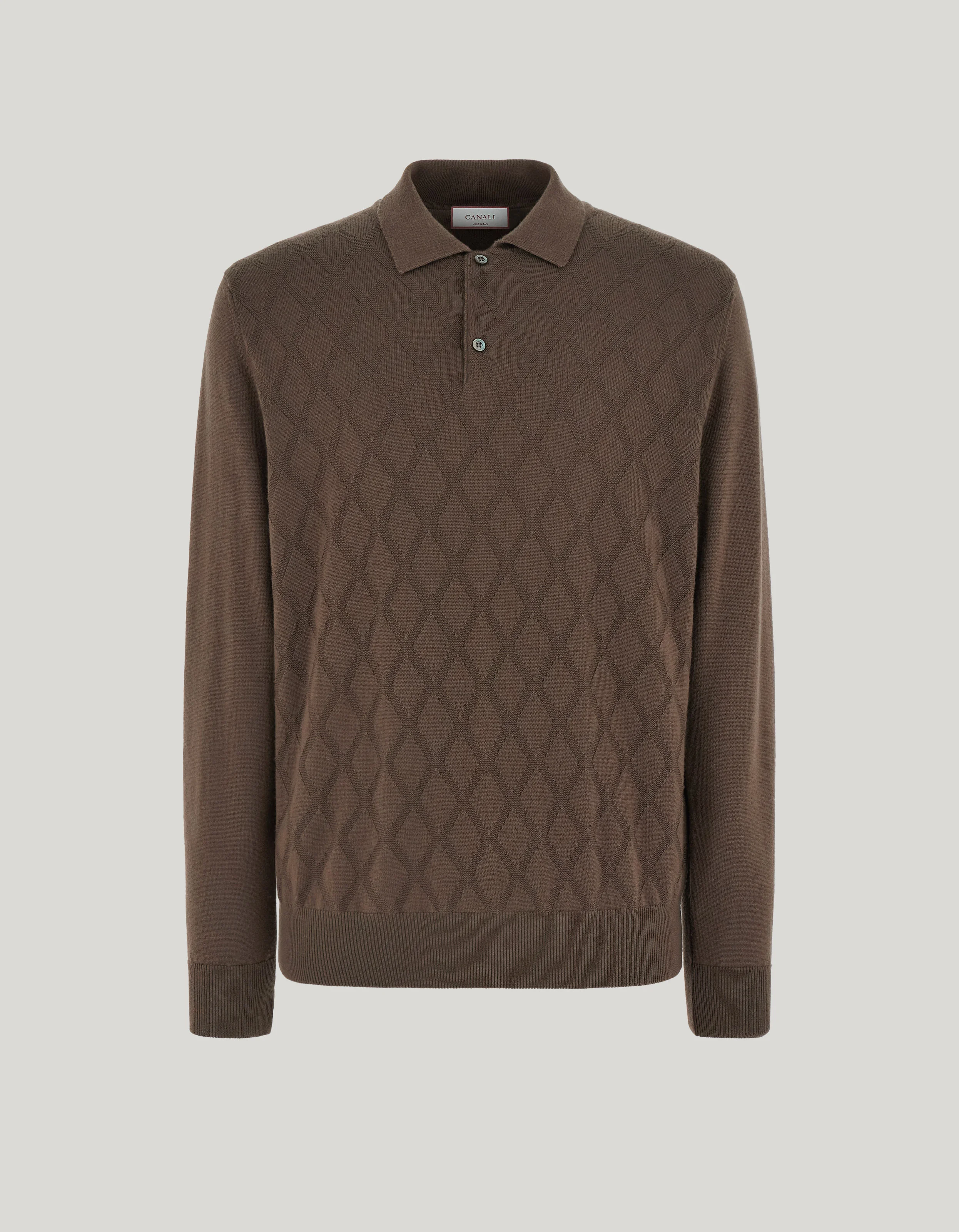Long sleeved polo shirt in extra-fine merino wool, an expression of dynamic elegance and contemporary functionality. The diamond structure on the front, contrasting with the plain knit sleeves, enhances the silhouette with sobriety and character. A versatile and refined piece, ideal for tackling both workdays and leisure time in style, always ensuring comfort and a well-groomed image. FABRICS AND CRAFTSMANSHIP - Long sleeved button-down polo shirt - Sail collar, ribbed hem and cuffs - Structured and plain knit - 12 gauge - 100% wool - Made in Italy CARE Hand wash max 40° Do not bleach Normal steam or dry iron on low (110°) Dry clean with perchlorethylene Do not tumble dry FIT The model is wearing a size 48 The model measures: Height: 189 cm (74.4 in) Chest: 98 cm (38.6 in) Waist: 82 cm (32.3 in) Hips: 97 cm (38.2 in)