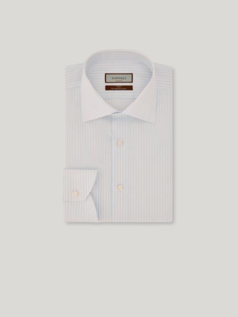Contemporary regular-fit formal shirt in cotton featuring a semi-spread collar and a clean design without a placket. Fine yarn ensures a soft touch and superior durability, while mother-of-pearl buttons add a touch of timeless sophistication. A garment designed for the man who seeks elegance and comfort in equal measure. FABRICS AND CRAFTSMANSHIP - Formal shirt - Semi-spread collar - Collar height 4.2 cm - Smooth front with no placket - Removable ribs - Smooth back with no pleats - Semi-rounded cuff - Mother of pearl buttons - 100% Cotton - Made in Italy CARE Machine wash max 30° - delicate cycle Do not bleach Normal steam or dry iron on low (110°) Gentle dry clean with perchlorethylene Do not tumble dry FIT Regular fit The model is wearing a size 50 The model measures: Height: 185 cm (72.8 in) Chest: 100 cm (39.4 in) Waist: 79 cm (31.1 in) Hips: 95 cm (37.4 in)