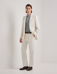 Pleatless pants in a linen-silk blend featuring a regular fit and essential lines that enhance the silhouette with natural elegance. The lightweight texture and refined fabric combine comfort and sophisticated style, ideal for the man who desires casual yet flawless summer elegance. FABRICS AND CRAFTSMANSHIP - Pleatless pants - American-style pockets and two welted back pockets - Hem 19.5 cm - 57% linen, 43% silk - Made in Italy CARE - Do not wash with water - Do not bleach - Normal steam or dry iron on low (110°) - Gentle dry clean with perchlorethylene - Do not tumble dry FIT Regular fit The model is wearing a size 50 The model measures: Height: 185 cm (72.8 in) Chest: 100 cm (39.4 in) Waist: 79 cm (31.1 in) Hips: 95 cm (37.4 in)
