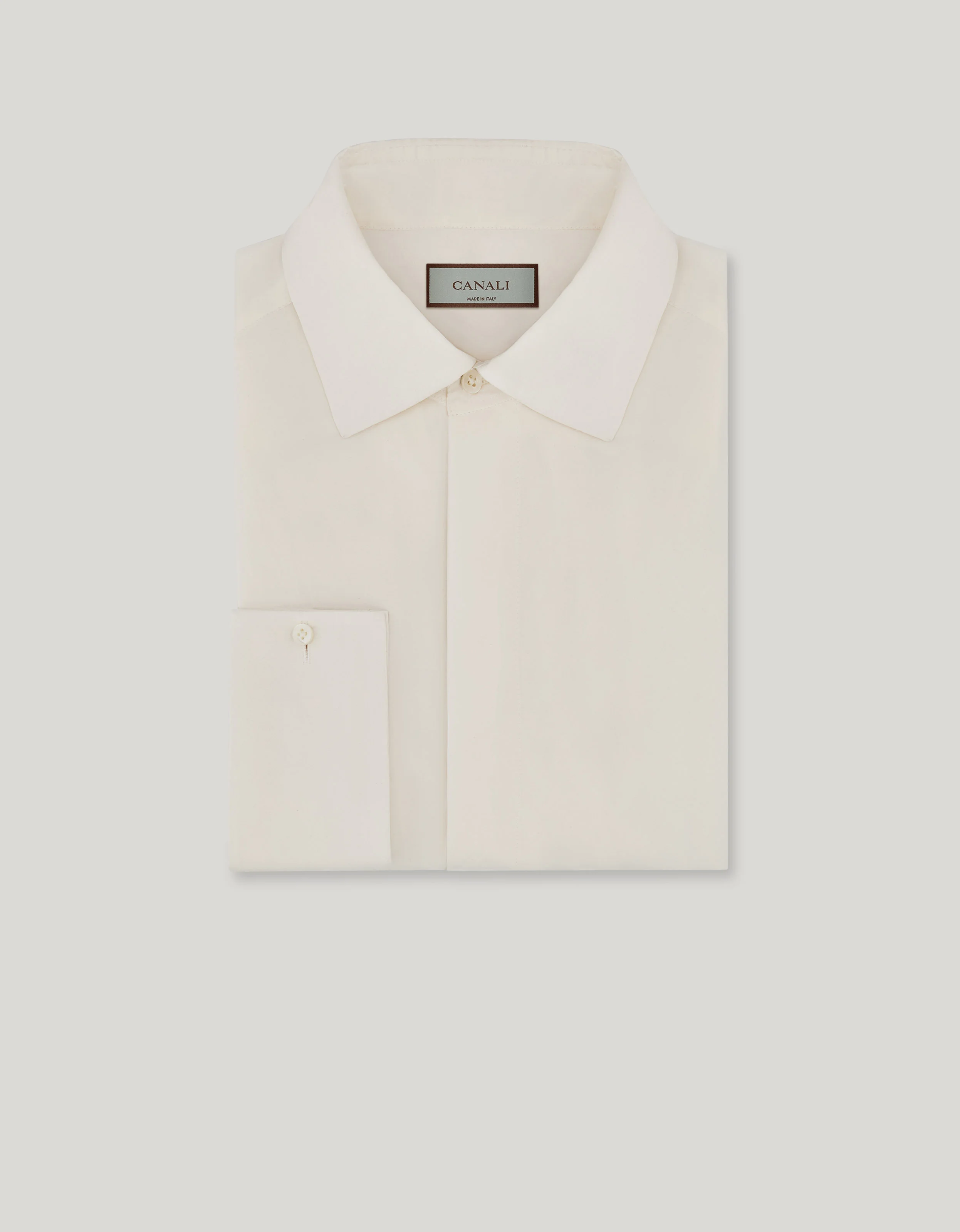Regular fit silk dress shirt with a semi-spread collar, removable ribs, and semi-rounded cuffs. The smooth back and concealed front placket ensure an elegant silhouette, while the fabric’s natural sheen adds contemporary charm to every formal occasion. FABRICS AND CRAFTSMANSHIP - Dress shirt - Semi-spread collar - Collar height 4.2 cm - Removable ribs - Smooth back with no pleats - Front with a concealed placket - Semi-rounded cuff - 100% Silk - Made in Italy CARE Do not wash with water Do not bleach Normal steam or dry iron on low (110°) Gentle dry clean with perchlorethylene Do not tumble dry FIT Regular fit The model is wearing a size 50 The model measures: Height: 185 cm (72.8 in) Chest: 100 cm (39.4 in) Waist: 79 cm (31.1 in) Hips: 95 cm (37.4 in)