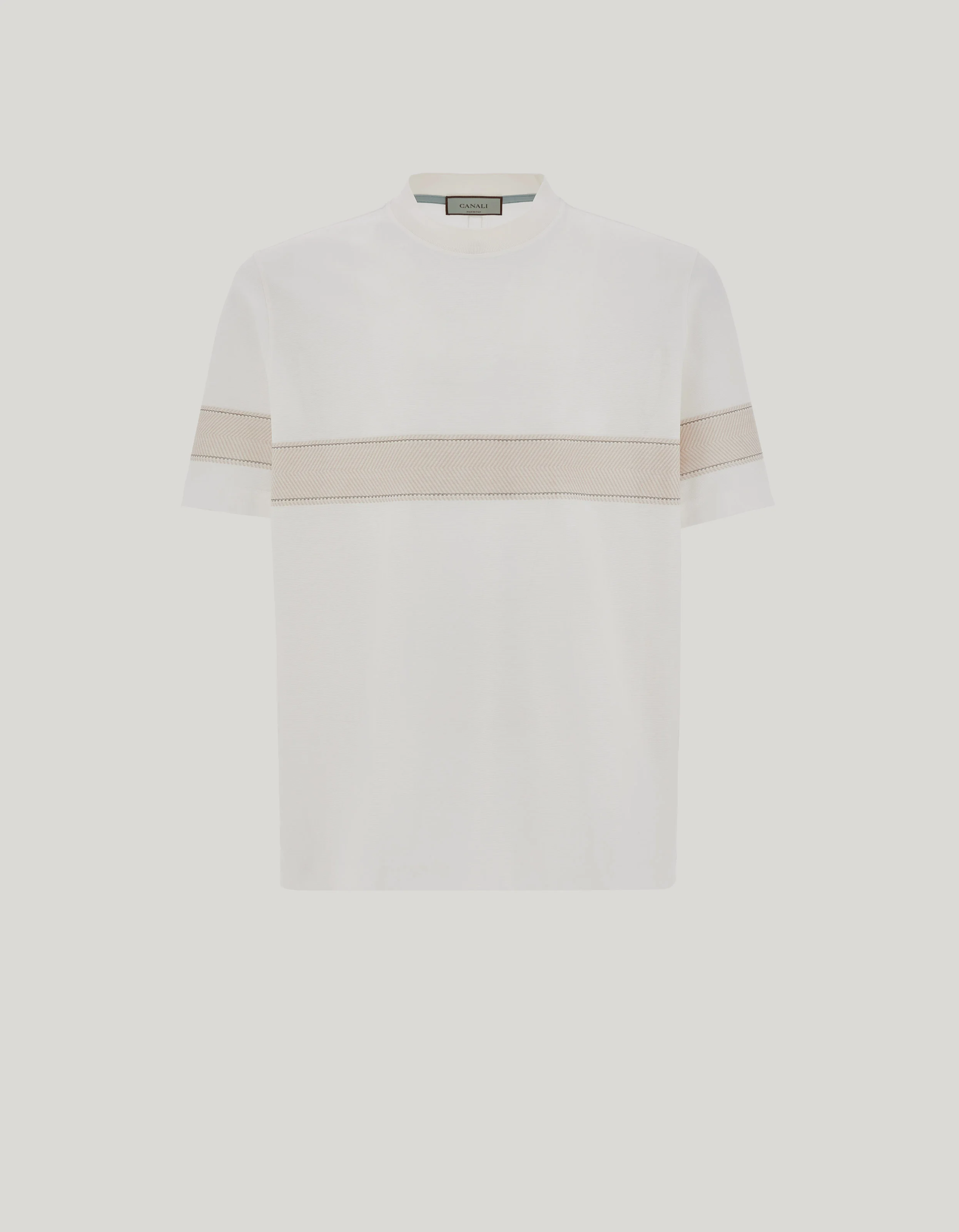 Short-sleeved pure cotton T-shirt, enhanced by a wide horizontal herringbone insert in contrasting hues. The compact knit collar adds structure to the essential design, while the clean line ensures comfort and versatility. A garment with refined and contemporary style, designed for the man who likes to discreetly stand out even in informal moments. FABRICS AND CRAFTSMANSHIP - Short-sleeved T-shirt - Knitted collar - Contrasting placed pattern -100% Cotton - Made in Italy CARE Machine wash max. 30° - extra-delicate cycle Do not bleach Normal steam or dry iron on low (150°) Dry clean with perchlorethylene Dry flat FIT The model is wearing a size 50 The model measures: Height: 185 cm Chest: 100 cm Waist: 79 cm Hips: 95 cm