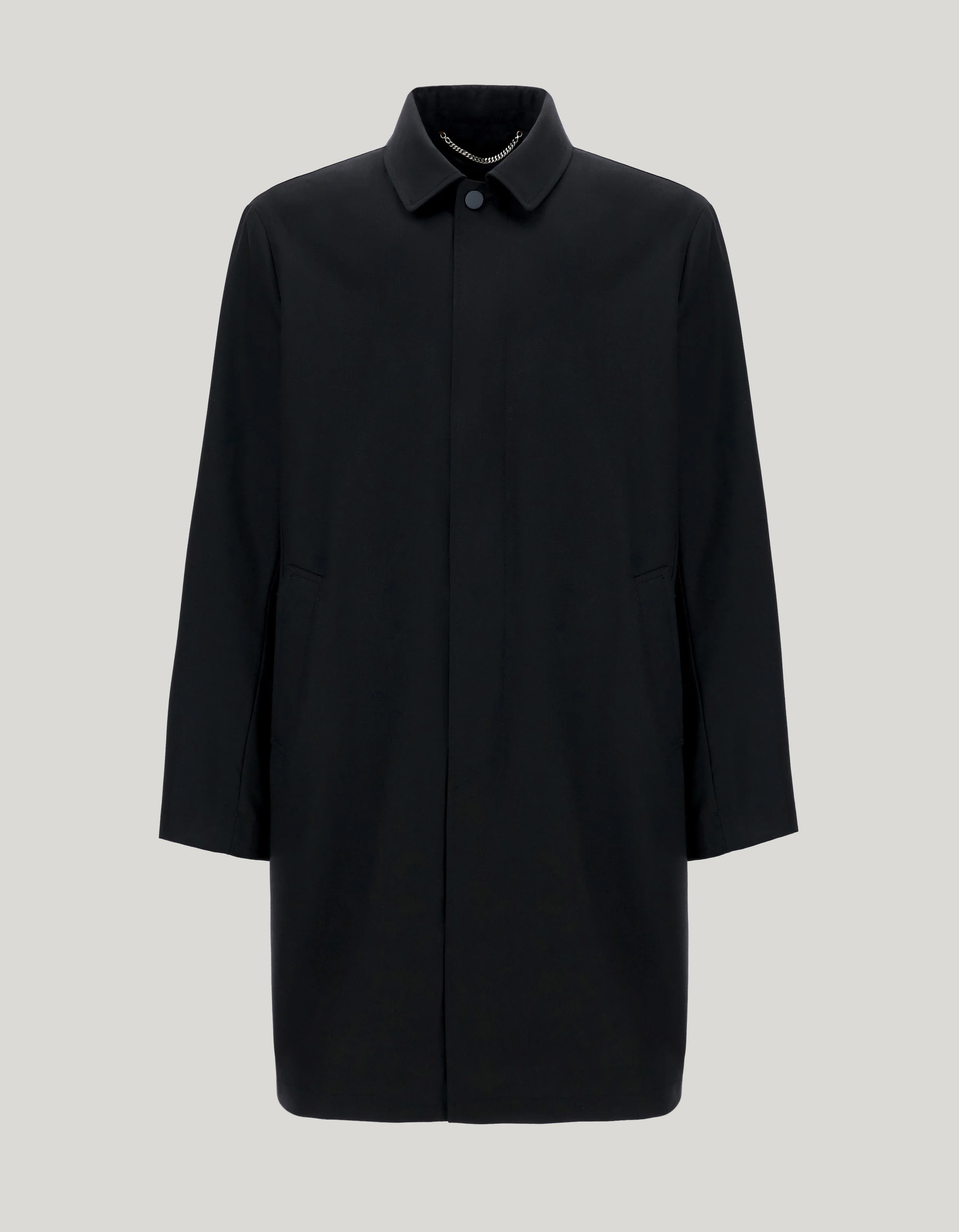 An emblem of the modern man's refined wardrobe, this car coat combines a relaxed appeal with a sophisticated design, featuring a single-breasted fastening, hidden snap pockets and a back slit. Practical features, such as the detachable inner lining made of technical fabric and the ultra-light padding, complete the model. Designed for the man who wants to infuse even casual occasion looks with sophistication. FABRICS AND CRAFTSMANSHIP - Car coat with single-breasted fastening - Pockets with concealed snap buttons - Back vent - Lined garment - Patch pocket - Detachable interior in technical fabric and ultra-light padding - 91% wool 9% polyamide - Made in Italy CARE Machine wash max 30° - delicate cycle Do not bleach Do not iron Gentle dry clean with perchlorethylene Do not tumble dry FIT The model is wearing a size 48 The model measures: Height: 190 cm Chest: 92 cm Waist: 75 cm Hips: 92 cm