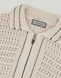 Long-sleeved zippered cardigan made of pure crocheted cotton, featuring three-dimensional workmanship highlights its sophistication. The pocket profiles with a leather insert and ribbed cuffs add a sophisticated touch to the design. A distinctive and versatile garment, ideal for the man who interprets contemporary casual style with relaxed elegance. FABRICS AND CRAFTSMANSHIP - Long-sleeved zippered cardigan - Ribbed sleeve cuffs - Pocket profile with leather detail - 3 gauge - 100% Cotton - Closed hem - Made in Italy CARE Hand wash max 40° Do not bleach Normal steam or dry iron on low (110°) Gentle dry clean with perchlorethylene Dry flat FIT The model is wearing a size 50 The model measures: Height: 185 cm Chest: 100 cm Waist: 79 cm Hips: 95 cm