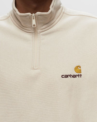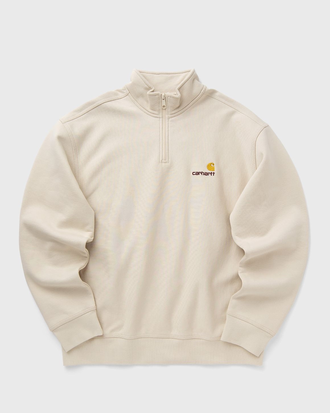 The American Script Half Zip Sweatshirt from Carhartt WIP is made from cotton-polyester fabric and brushed for added softness and warmth. The breathable top features a high neckline with zipper and a loose fit. The design is rounded off with subtle embroidery. - High neck with zipper - Ribbed cuffs and hem - Logo embroidery Article Number: I027014-MOO.XX Gender: Men Color: MOONBEAM Material: 80% Cotton, 20% Polyester