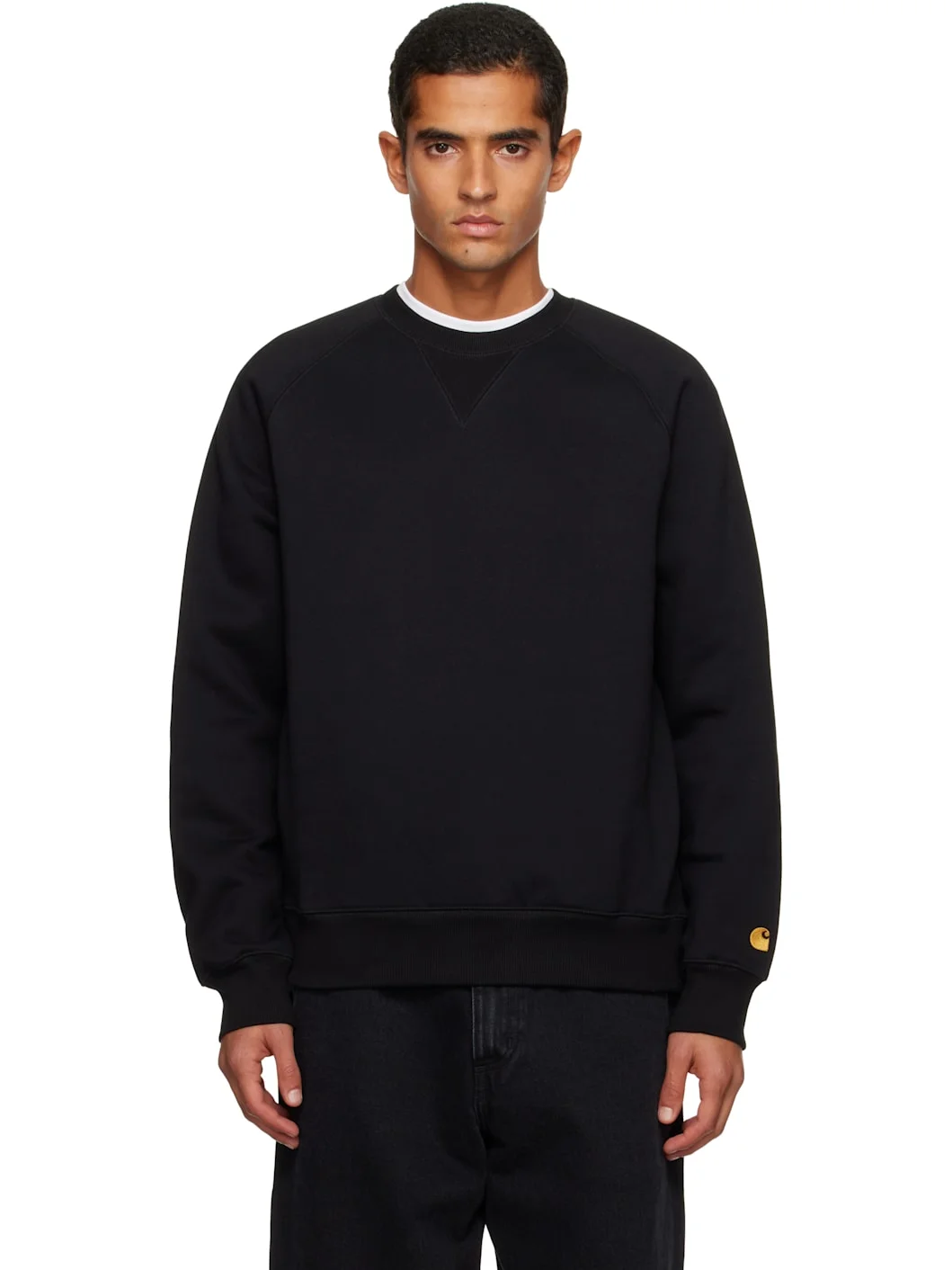 Heavyweight 440 gsm cotton-blend fleece sweatshirt. · Rib-knit crewneck, hem, and cuffs · Raglan sleeves · Logo embroidered at cuff Supplier color: Black Body: 58% cotton, 42% polyester. Trim: 96% cotton, 4% elastane. Made in Pakistan 252111M204000