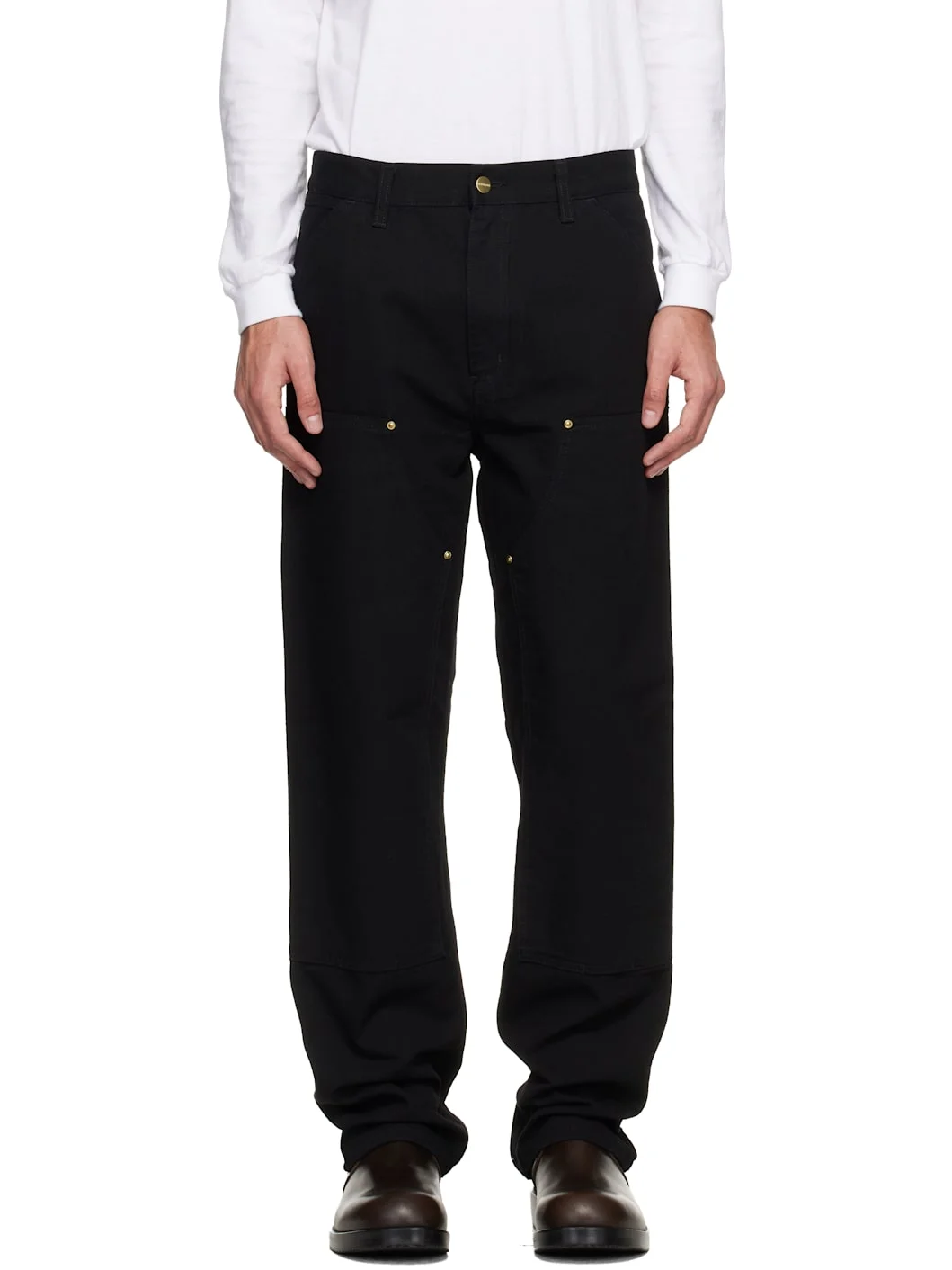 Heavyweight 12 oz organic cotton canvas trousers. · Straight-leg · Mid-rise · Belt loops · Five-pocket styling · Zip fly · Reinforced panel at front legs · Hammer loop and patch pockets at outseams · Logo patch at back pocket · Logo-engraved gold-tone hardware Supplier color: Black Rinsed Body: 100% cotton. Pocket lining: 65% polyester, 35% cotton. Made in Tunisia 261111M191003