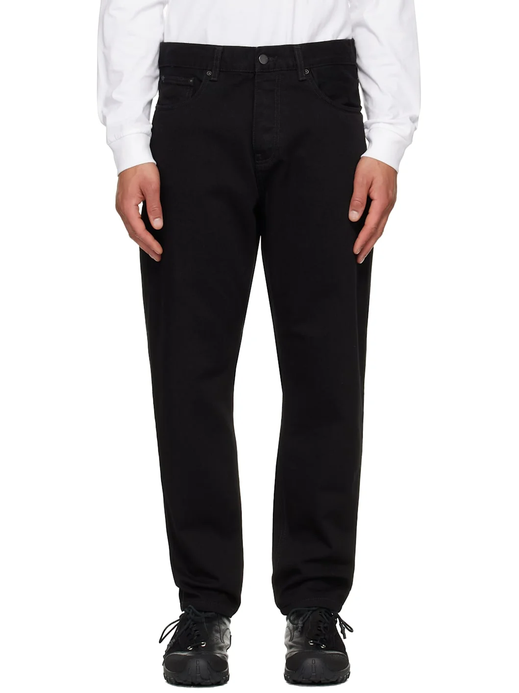 13.5 oz non-stretch organic cotton denim jeans. · Fading throughout · Loose-fit, tapered · Belt loops · Five-pocket styling · Button fly · Logo patch at back pocket · Logo-engraved gunmetal-tone hardware Supplier color: Black (one wash) Body: 100% cotton. Pocket lining: 65% polyester, 35% cotton. Made in Tunisia 261111M186002
